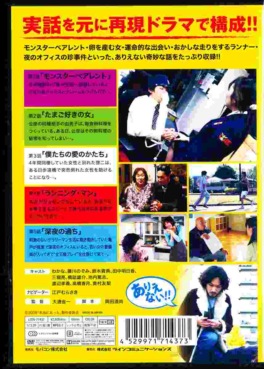 実話を元に’本当にあったありえない話’を再現したショートドラマ集。新米教師・夕貴は生徒への指導の仕方について親たちから次々とクレームを付けられ…。「モンスターペアレント」「たまご好きの女」「僕たちの愛のかたち」ほか、全5話を収録。