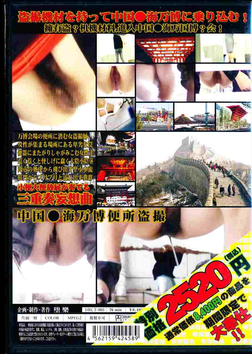 盗撮機材を持って中国○海万博に乗り込む。万博会場の便所に潜む女盗撮師。女性が集まる場所にある卑劣な罠。便器にまたがりしゃがみこむ女性達。ひくひくと怪しげに蠢く大陰小陰唇。肉壷の奥中から飛び出す聖小水流。肛門からブリブリと溢れ出す糞群。小便大便放屁の三重奏妄想曲。