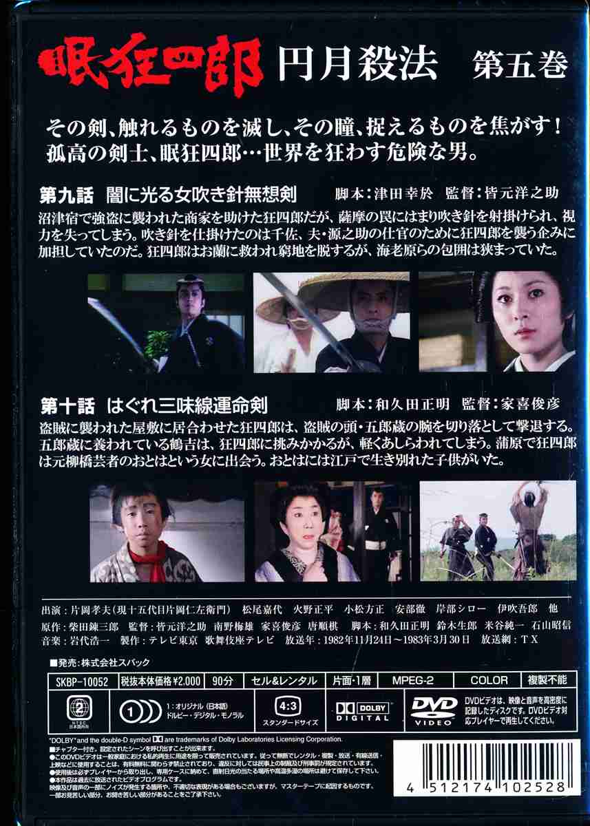 柴田錬三郎の時代小説を、片岡孝夫主演でドラマ化したTV時代劇シリーズ第5巻。ひょんなことから命を狙われるハメになった孤高の剣士・眠狂四郎が人情を織り交ぜながら事件を解決していく。松尾嘉代、火野正平が共演。第9話と第10話を収録。
