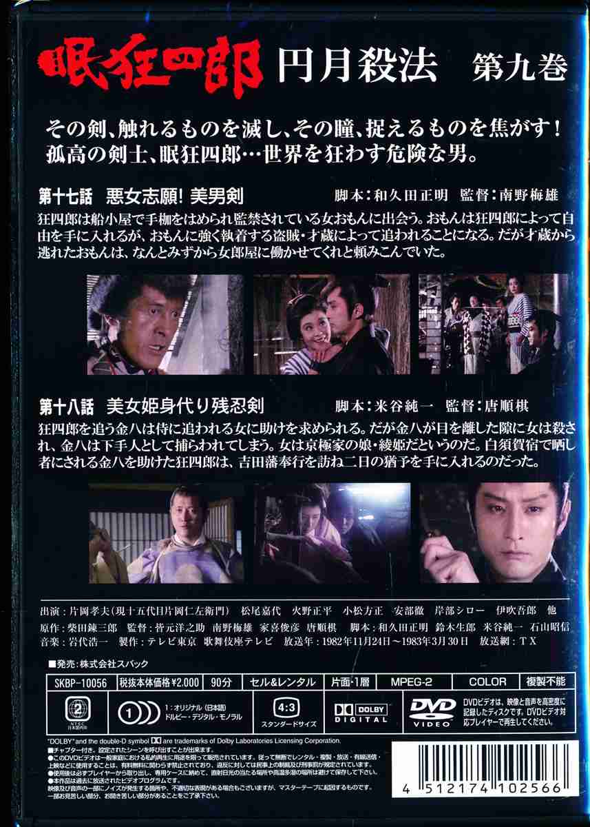 柴田錬三郎の時代小説を、片岡孝夫主演でドラマ化したTV時代劇シリーズ第9巻。ひょんなことから命を狙われるハメになった孤高の剣士・眠狂四郎が人情を織り交ぜながら事件を解決していく。松尾嘉代、火野正平が共演。第17話と第18話を収録。