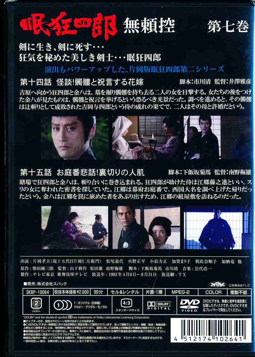 柴田錬三郎原作、片岡孝夫主演による人気TV時代劇の第2シリーズ第7巻。11代将軍・徳川家斉治世の江戸を舞台に、転びバテレンの子として虚無と孤独の中に生きる剣士・眠狂四郎と、彼に関わる人間たちの生き様を描く。第14話と第15話を収録。