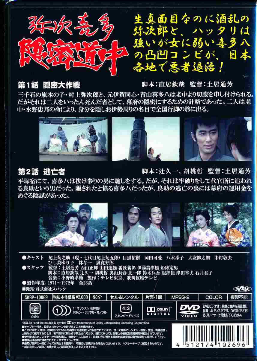 尾上菊之助と目黒祐樹の軽快な演技が光る痛快娯楽時代劇第1巻。時は天保。老中・水野越前守忠邦は、隠密を素人に任せてみることを思い付き、村上弥次郎と青山喜多八を特命捜査官に任命する。第1話「隠密大作戦」と第2話「逃亡者」を収録。
