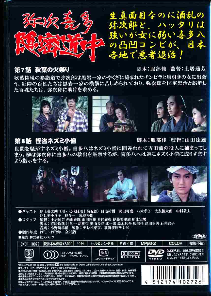 尾上菊之助と目黒祐樹共演による痛快時代劇第4巻。真面目な性格だが酒癖が悪い村上弥次郎と、女好きの元伊賀同心・青山喜多八。特命捜査官に任命された凸凹コンビによる隠密道中を描く。第7話「秋葉の火祭り」と第8話「怪盗ネズミ小僧」を収録。