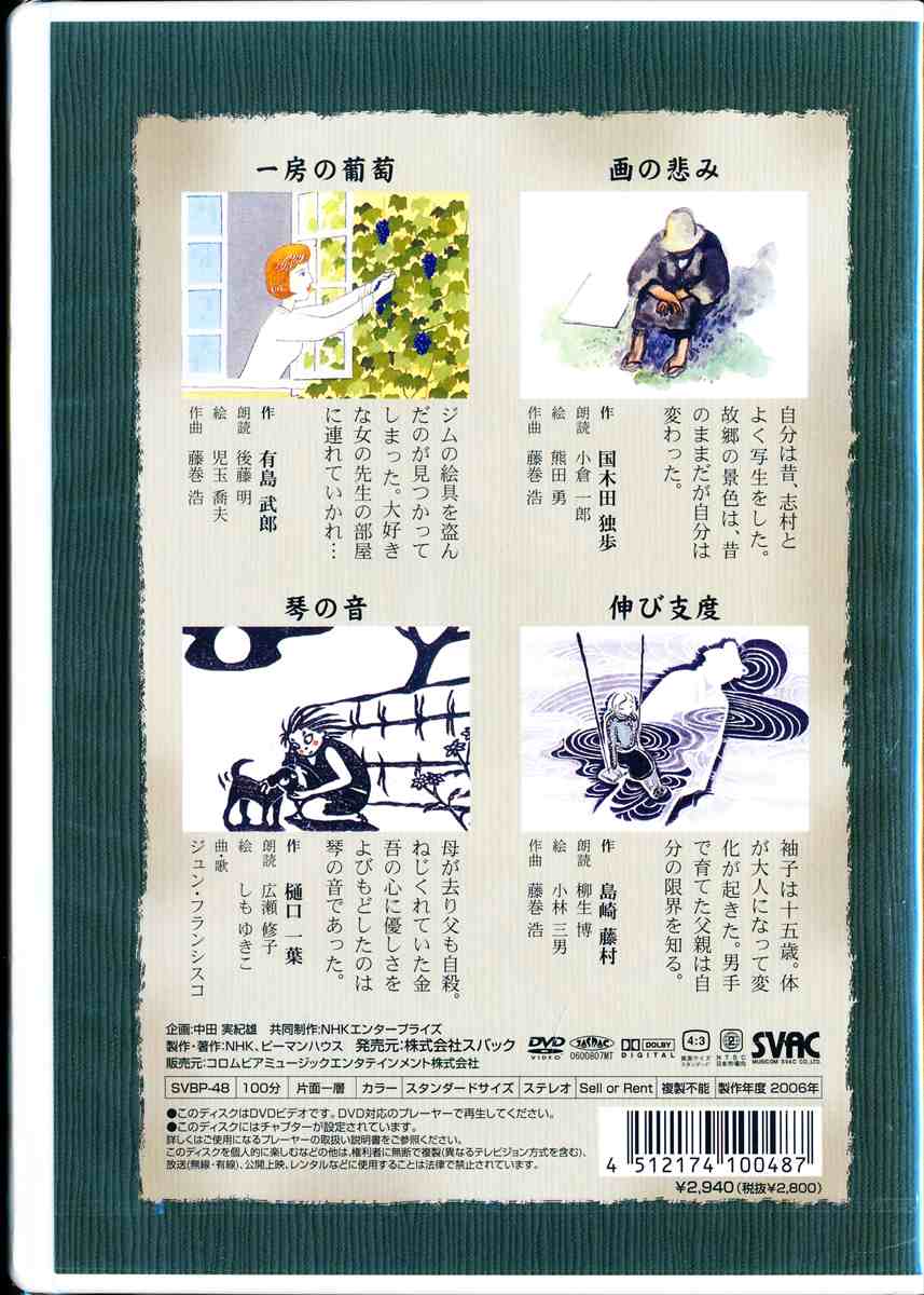 素晴らしい絵と音楽と朗読で楽しむ、珠玉の純文学。見ているだけで日本文学の名作が楽しめる。「画の悲しみ」「伸び支度」「一房の葡萄」「琴の音」を収録。