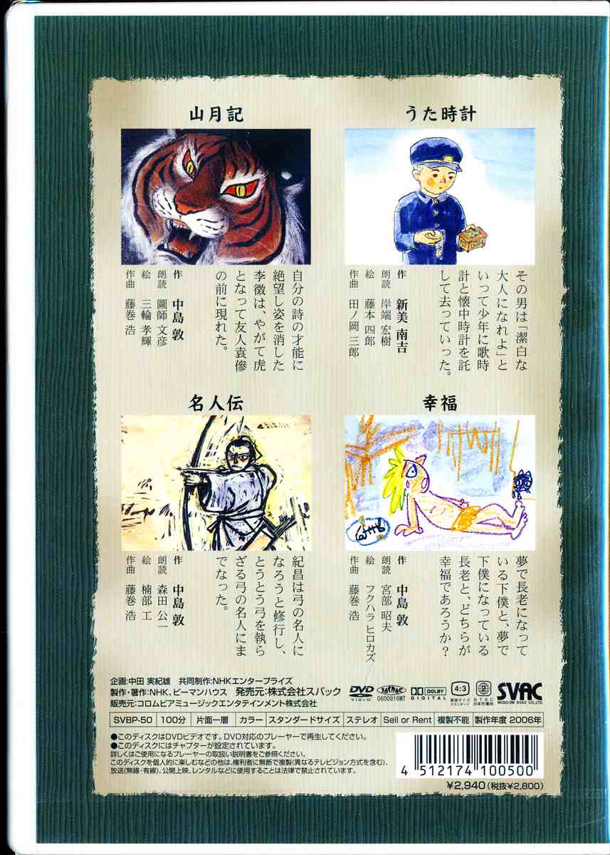 素晴らしい絵と音楽と朗読で楽しむ、珠玉の純文学。見ているだけで日本文学の名作が楽しめる。「うた時計」「幸福」「山月記」「名人伝」を収録。