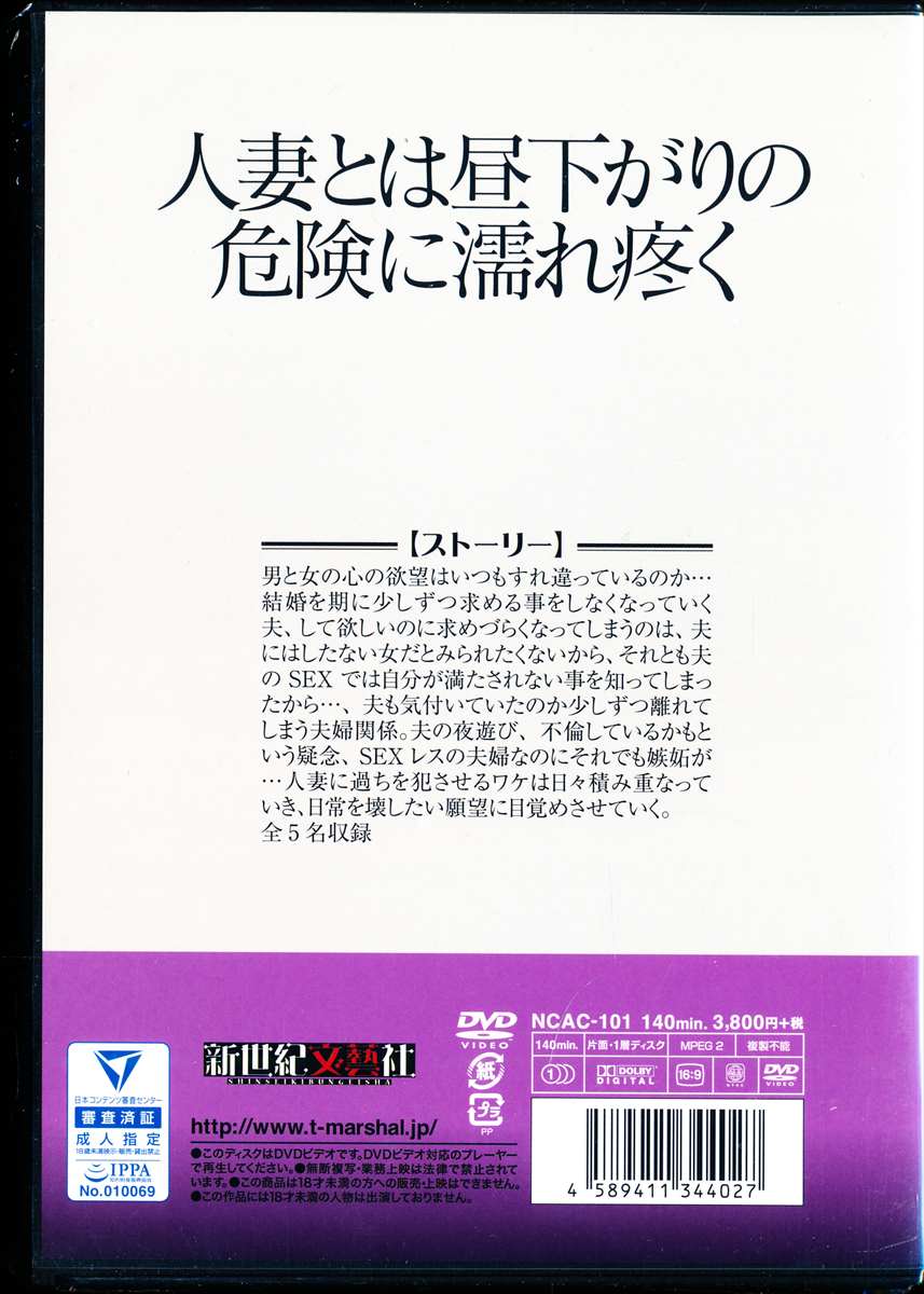 日常を壊したい願望に目覚めた5人の人妻たちの劣情風景を激撮。スレンダー美女・マナさんはその日出会った巨根の男とホテルの一室でまぐわい、夫の夜遊びとセックスレスに悩むミサコさんはAVに出演して…。