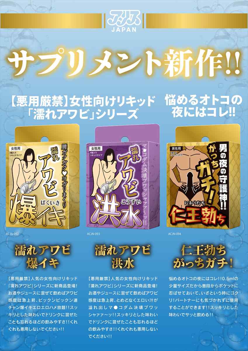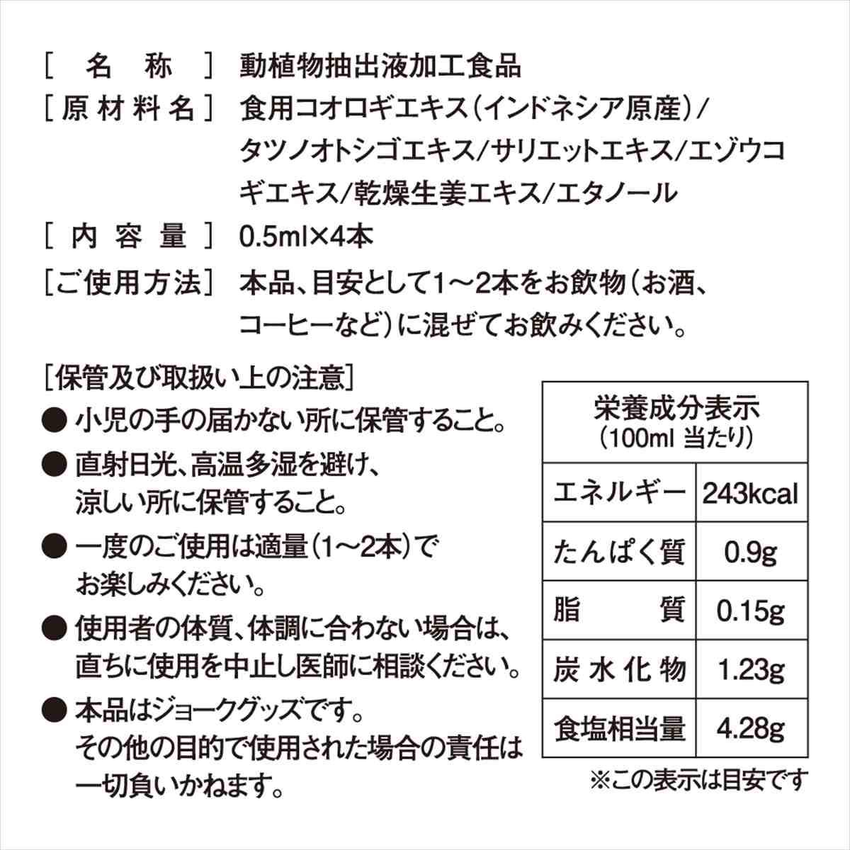 【悪用厳禁】人気の女性向けリキッド「濡れアワビ」シリーズに新商品登場!お酒やジュースに混ぜて飲めばアワビ感度は急上昇、とめどなくエロい汁が溢れ出しマ●コダム決壊ブワッシャァァ〜ッ!!スッキリとした味わいでドリンクに混ぜたことも忘れるほどの飲みやすさ!!くれぐれも悪用しないでください!![原材料名]食用コオロギエキス/タツノオトシゴエキス/サリエットエキス/エゾウコギエキス/乾燥生姜エキス/エタノール[内容量]0.5ml×4本[ご使用方法]本品、目安として1〜2本をお飲物(お酒、コーヒーなど)に混ぜてお飲みください。