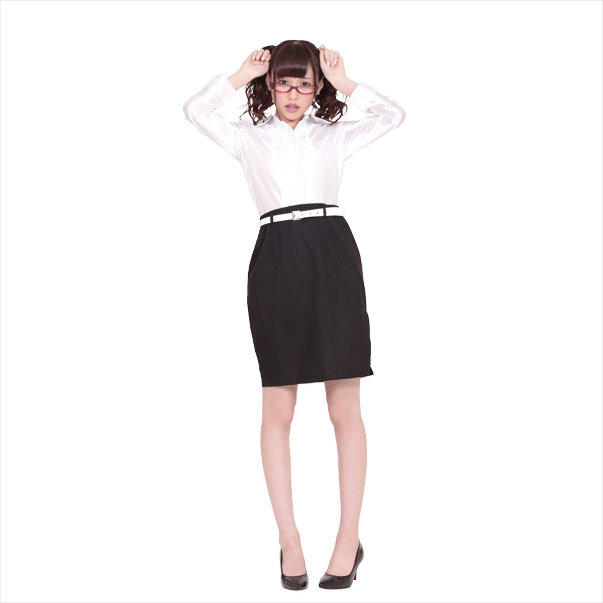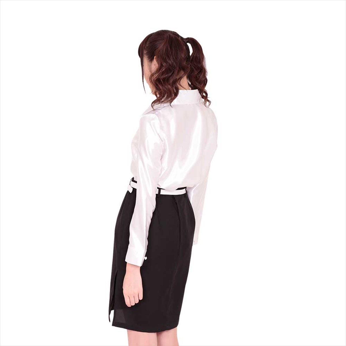 光沢サテンのフリルブラウスのセット!ベルト付ひざ上タイトは、深めのスリット入り