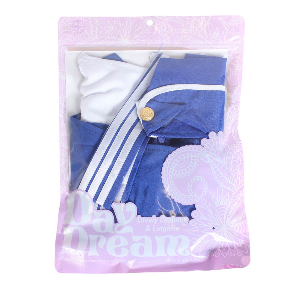 鎖骨のチラ見せでアバンチュール感を楽しんで。金ボタン、白と青のサテンリボンが華やかなアクセントに!サイズ詳細:上着丈41cm ウエスト66cm スカート丈29cm ネックリボン長さ83cm
