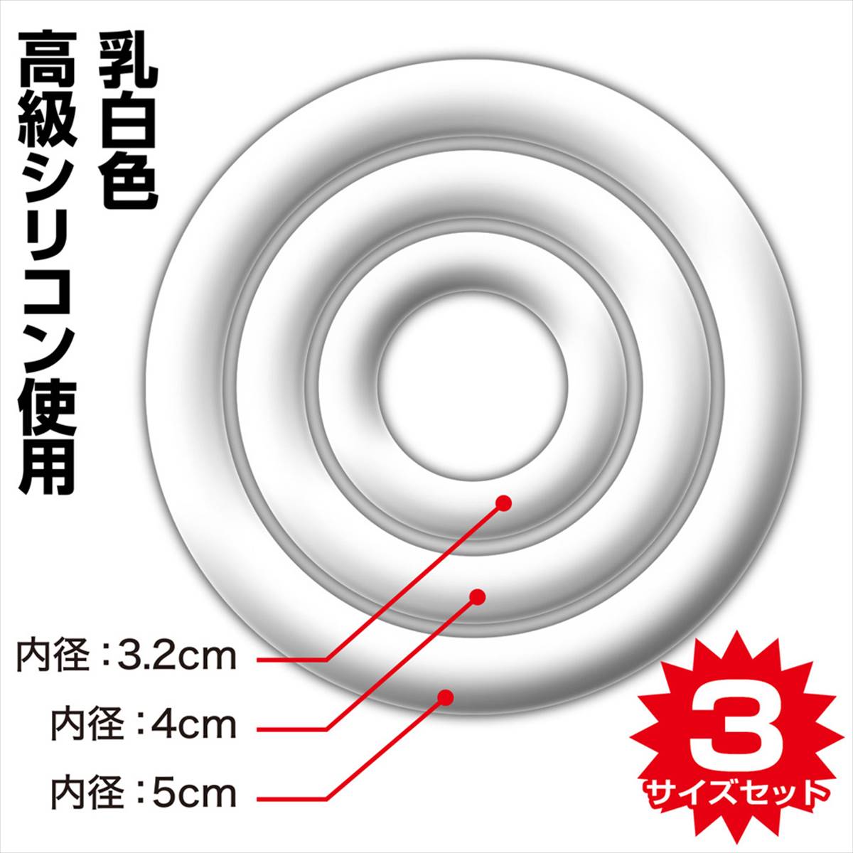 男性自身を魅力的にさせるシリコン製メンズリング3点セットです。装着箇所やシチュエーションを問わない、選べる大中小サイズのリングをセットにしました。お肌に優しく触り心地も良いシリコン素材で、装着時の違和感もありません。伸縮性がありますので、大きさに問わずにバツグンのフィット感です。本体カラーは、スタンダードな乳白色。