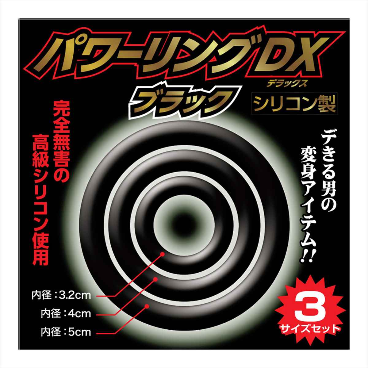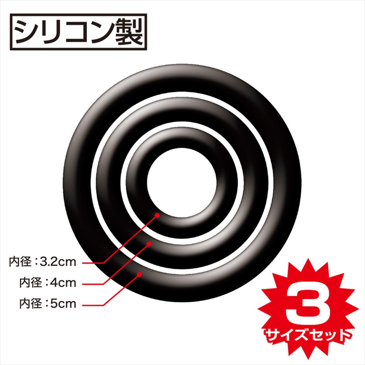 男性自身を魅力的にさせるシリコン製メンズリング3点セットです。装着箇所やシチュエーションを問わない、選べる大中小サイズのリングをセットにしました。お肌に優しく触り心地も良いシリコン素材で、装着時の違和感もありません。伸縮性がありますので、大きさに問わずにバツグンのフィット感です。本体カラーは、引きしまるブラック。