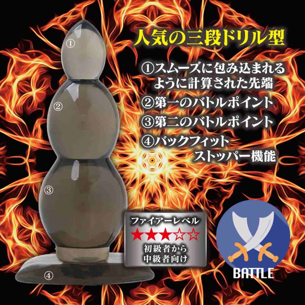 初心者にもアナニーにも最適!適度な弾力と適度な柔らかさの、抜群の素材を使用!初心者サイズに、中級者クラスの形状を採用しました!弾力のある素材が、誰にでもぴったりとフィットし、心地よくも激しく貴方を刺激します。素材臭が少なく、微妙な柔らかさと絶妙な弾力のある高級TRを使用しています。初心者〜上級者まで幅広くお楽しみいただける商品です。バトルは、人気の3段ドリル型。何段目まで突入できるか、お試しあれ!