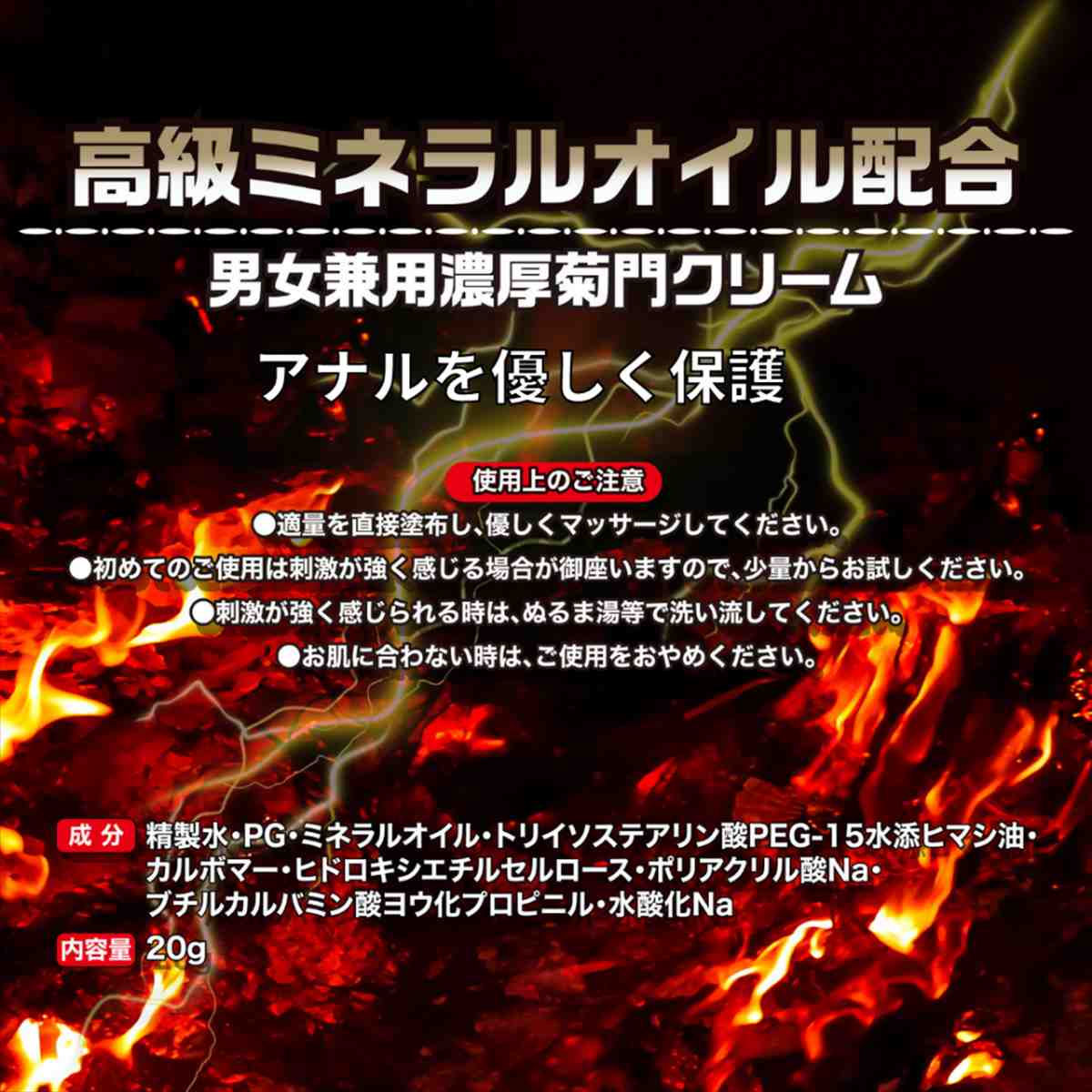 バックファイアーからついにア●ルクリームが発売!その名も「AENUS CREAM 悶絶 菊感 ヌルーミー」少量の使用で長時間のプレイが可能!驚きの潤滑性!ミネラルオイル配合で乾きにくく、肌にも優しい。使用法は簡単、適量を手に取り、マッサージするように塗ってください。敏感部分をプロテクトしながら、一人でもパートナーでもプレイを楽しめます。液だれの心配がなく、アダルト玩具との相性も抜群です。ノンラベル仕様なので、鞄などに入れて持ち歩いても、ア●ル用クリームとばれないので安心です。内容量:20g