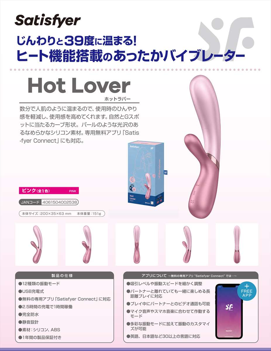 ●じんわりと39度に温まる!ヒート機能搭載のあったかバイブレーター●12種類の振動モード●無料の専用アプリ「Satisfyer Connect」に対応●USB充電式(2.5時間の充電で約60分間稼働)●完全防水●静音設計●1年間の製品保証付