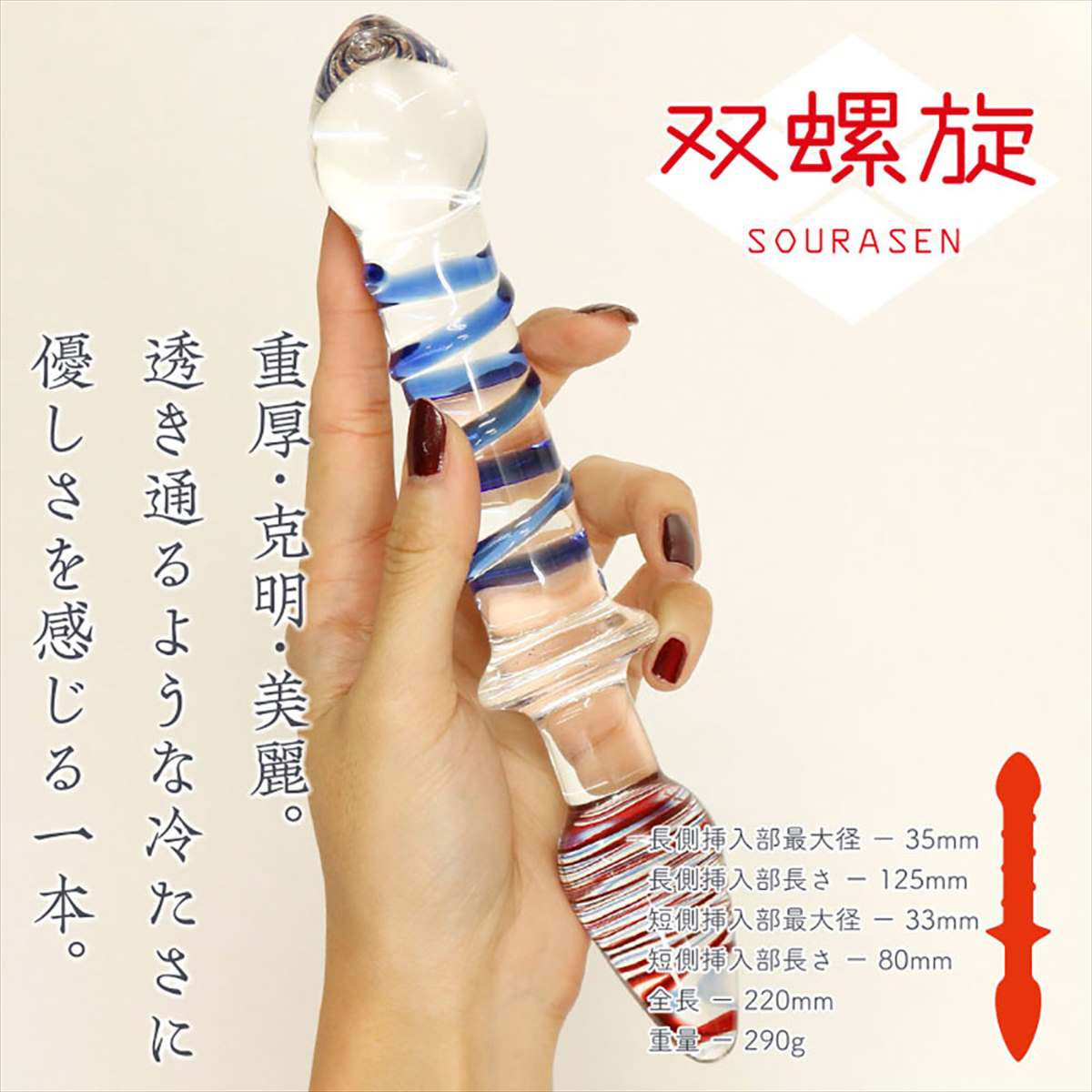 『クリスタルアイス』は見るものを魅了する流線形にこだわったガラス製のディルドです。安全性にこだわった繋ぎ目のない流線形でデザインされたフォルムは角がなく肌に対する優しさにあふれています。【06ソウラセン】前と後ろを刺激できる双頭タイプのガラス製ディルドです。ガラス独特のツルンとした質感と滑らかなフォルムで優しく挿入できます。胴体にらせん状に成形された突起が内部をしっかり刺激してくれます。反対側には直径33mmのア●ルプラグ型ディルドを成型。挿入時のガラス独特の冷たさは日常では味わえない、刺激的な感覚でクセになります。この冷たさを敏感な部分で感じることが最大の魅力でもあります。長側挿入部最大径:35mm 長側挿入部長さ:125mm 短側挿入部最大径:33mm 短側挿入部長さ:80mm 全長:220mm 商品重量:290g 外装重量:335g