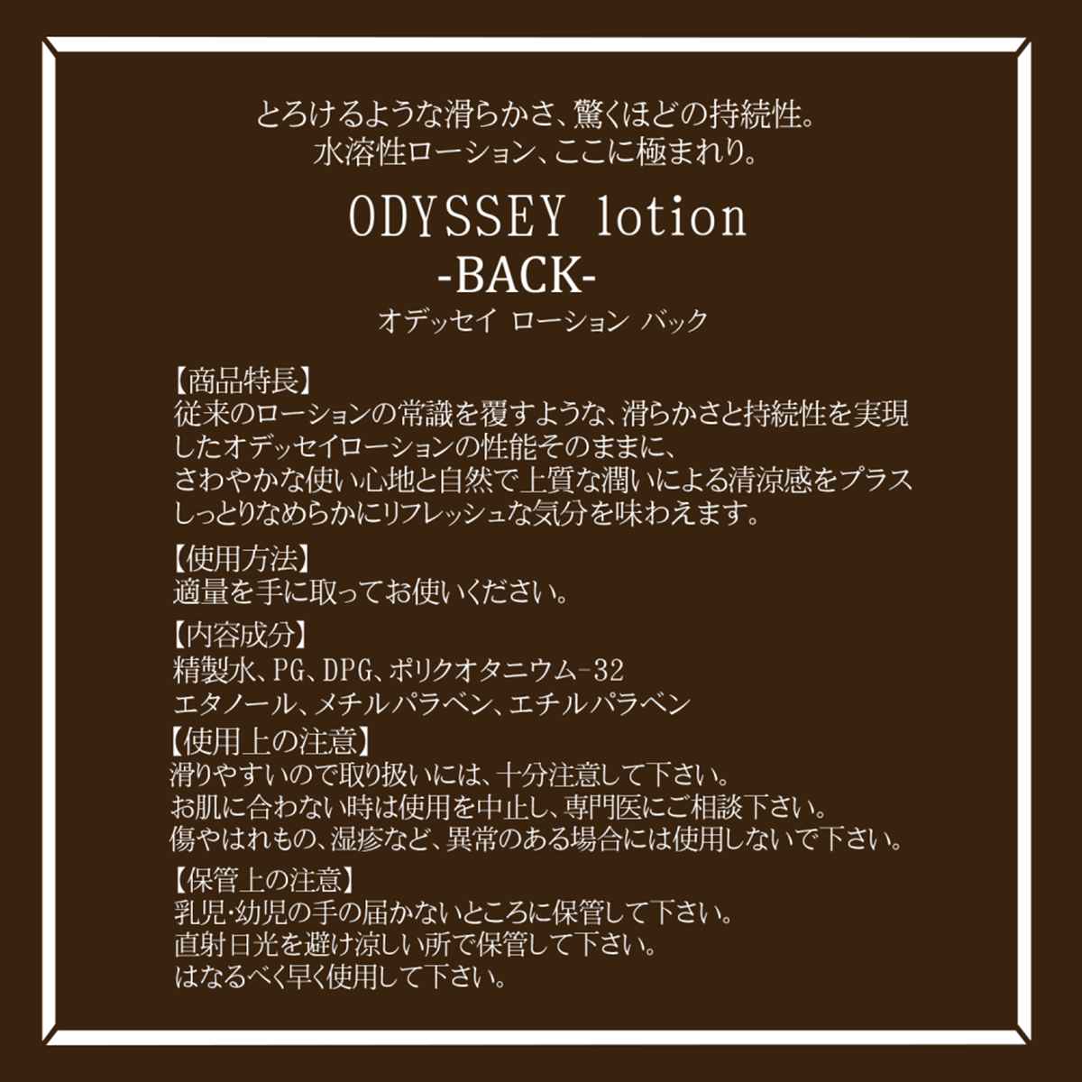 とろけるような滑らかさ、驚くほどの持続性、水溶性ローションここに極まれり。従来のローションの常識を覆すような、滑らかさと圧倒的な持続性を実現したオデッセイローションの性能そのままに、グリセリンフリーになりました。ア○ルプレイのお供にいかが。