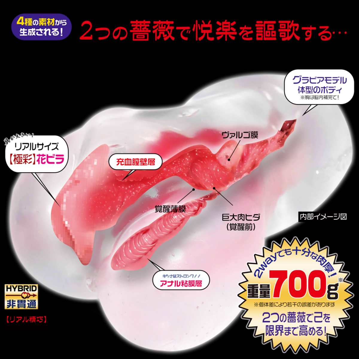 重量感たっぷり700gのラビアンローゼスにハードバージョンが新登場。ボディ・花ビラ・チ●粘膜・ア●ル粘膜をすべて別素材で作るという精巧な逸品!入口のぷにぷに花ビラで視覚へ挑発し、ボディ・粘膜は男の本能を刺激、使い込むことにより変化を及ぼす覚醒ギミックを搭載!キツさストロングのア●ル粘膜層は、別次元の良さがあり、合理的2WAY構造により幅広くお楽しみ頂けます。欠点を排除し、二穴と重量感を存分に楽しめる工夫された逸品です!! ローション付属