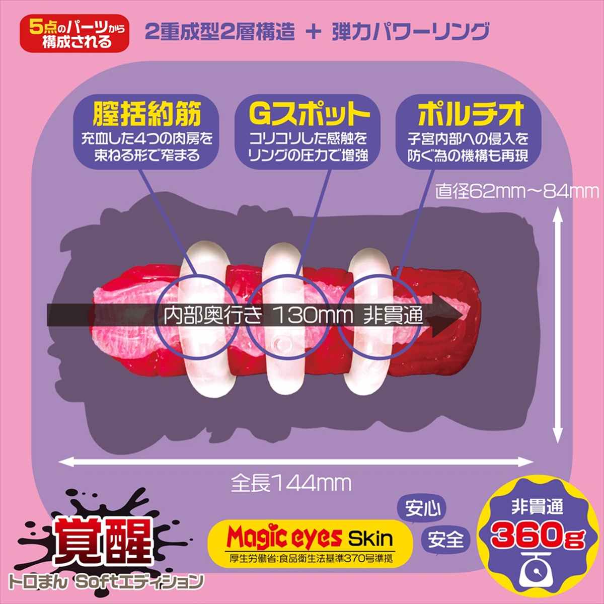 3連パワーリングを搭載した欲情ギミックが覚醒クリアソフト素材を纏って新登場!内部のトロけてねばりつくMeltコアは生態テクスチャ仕様になっており、ち●括約筋部、G●ポット部、ポ●チオ部にそれぞれ装着されたパワーリングをより感じられます。ローション付属