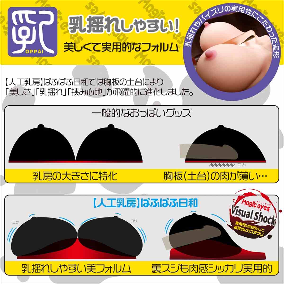 乳揺れ注意、人工乳房ぱふぱふ日和は男を狂わすリアルサイズの谷間をぱふぱふしたり揺らしたりして楽しめます。素材には肌膚皮膜を搭載したラブラバSkin(厚労省食品衛生法、第370号準拠素材採用)を採用し乳首層と肌膚層、内部層の3層構造で使用感アップ!重量は実用的な3.0Kgで美しさ揉み心地、抜き心地は本物以上。特大ポスター付属。日本製