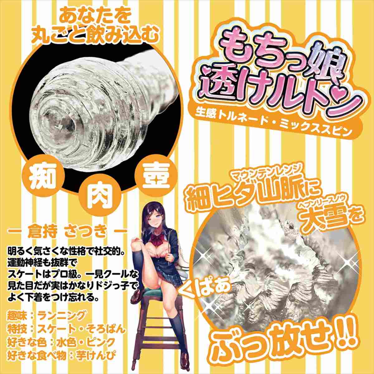 八連の山ミゾが波打ちながら螺旋のように絡みつく、全長17cmオールクリアのボディは入っているところが見えるエチエチ仕様。素材はクリアでも固くない日本製の「やわらかクリスタルTPE」(厚生労働省:食品衛生法370号準拠素材使用)を採用していますので安心してご使用頂けます。