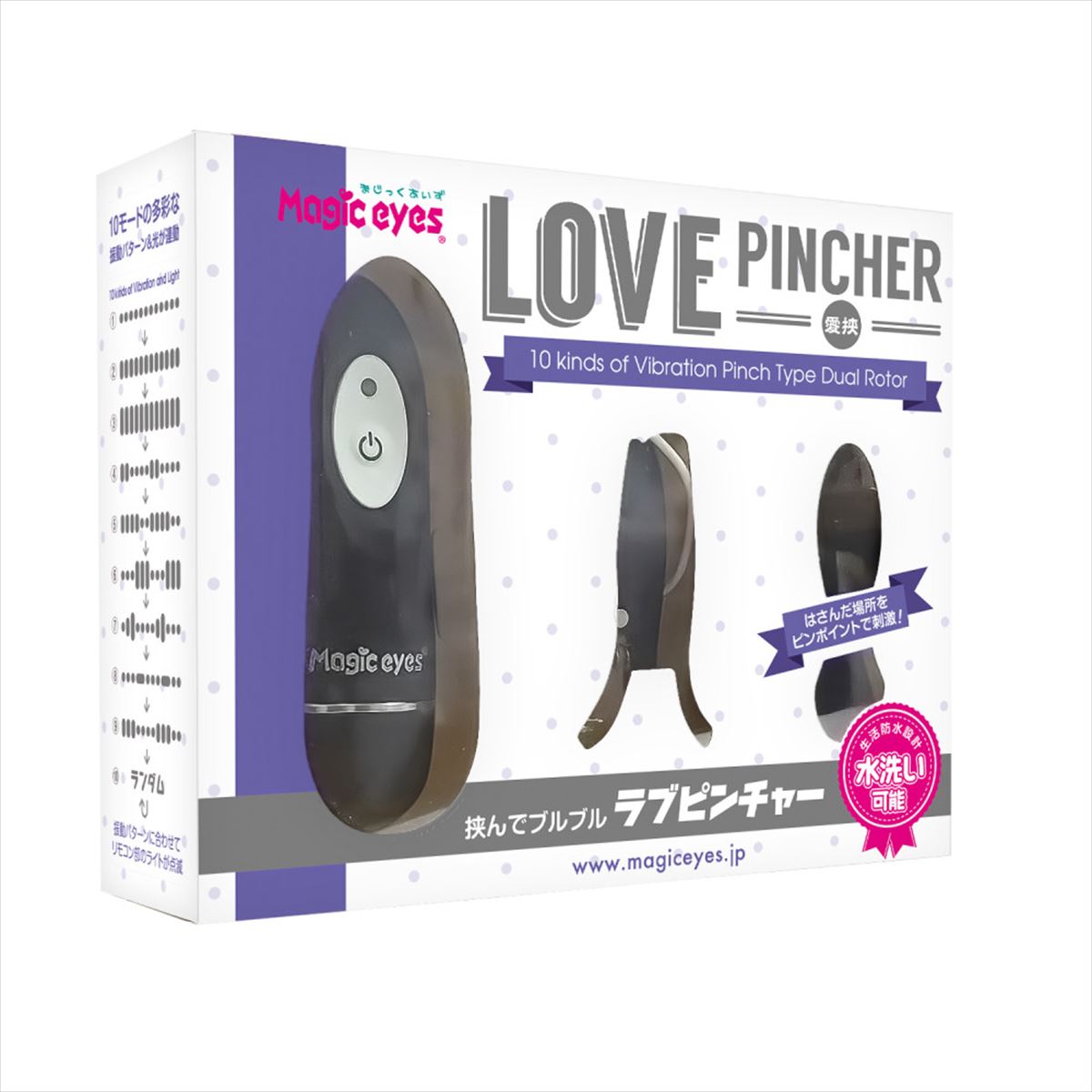 挟んでブルブル、ラブピンチャーに新色登場!!クリップ部はわずか7gに超小型モーターを搭載し軽量かつパワフルな為、乳首だけではなく敏感な部分にもご使用頂けます!!10モードの多彩な振動パターンは必ずあなたのお好みのモードが見つかるはず?!リモコン部は振動パターンにLEDランプが連動している為、暗い場所でも確認できます。防水性にも優れ使用後は丸洗いして清潔に保管頂けます!マット加工を施している為、高級感もあり静音設計のため、一人でコソコソと使用することも…。ただのローターでは飽きた、物足りない等の方にもおすすめ!!Magiceyesより長く愛して頂けるクリップ型ダブルローター是非ご堪能下さい!!単四電池2本使用
