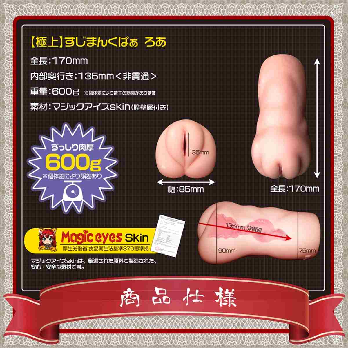 「すじまんくぱぁろあ」の10周年を記念した35mmの理想のタテスジで設計された極上すじまんくぱぁろあ。良いところはそのままに少し大人になったろあをリアルな7本のボテひだで表現。ハンドホールでは大型な600gの肉厚ボディだからこその特大ヒダの肉壁。秘密のポストカードとローション、保存用クリアケースも付属していますので存分にお楽しみください。