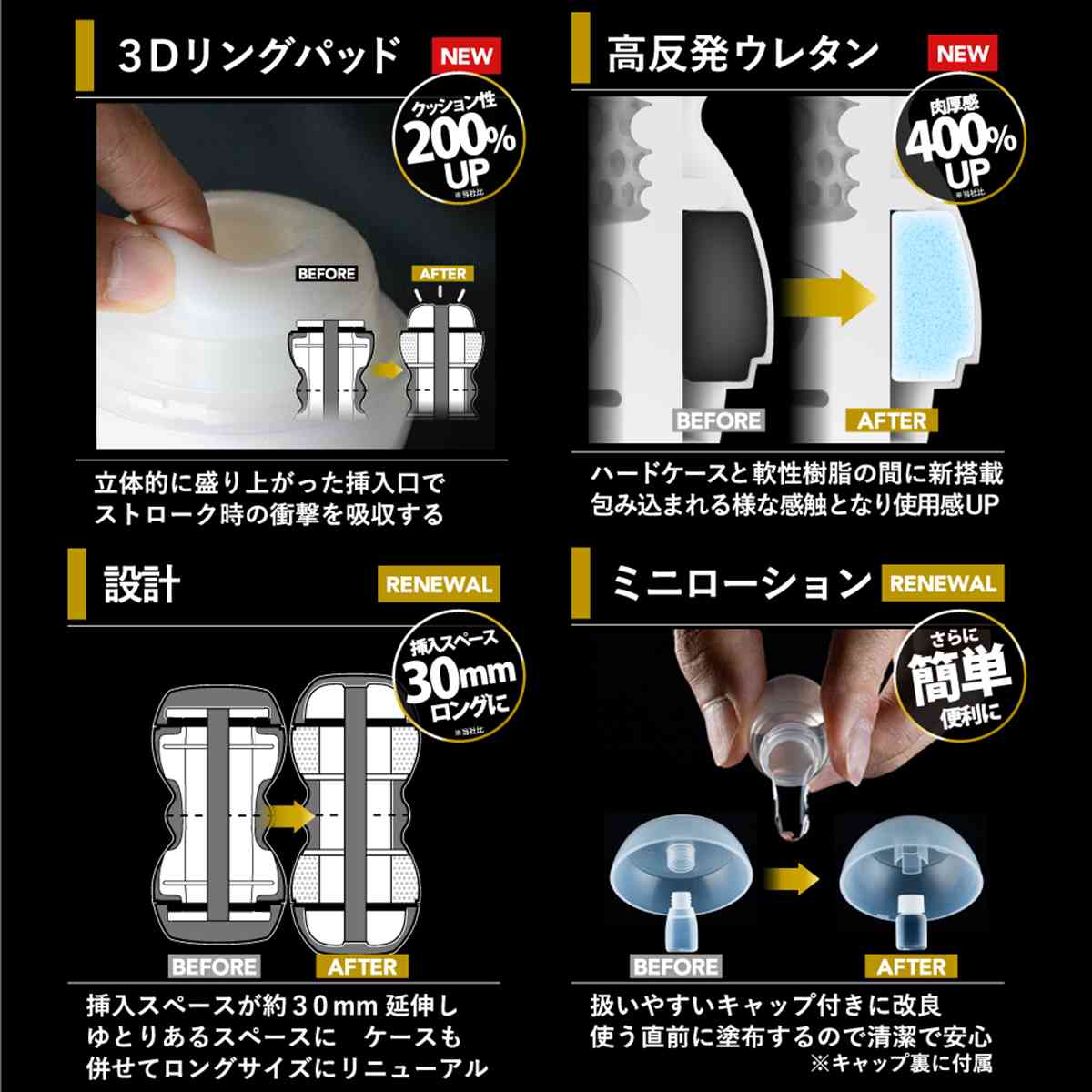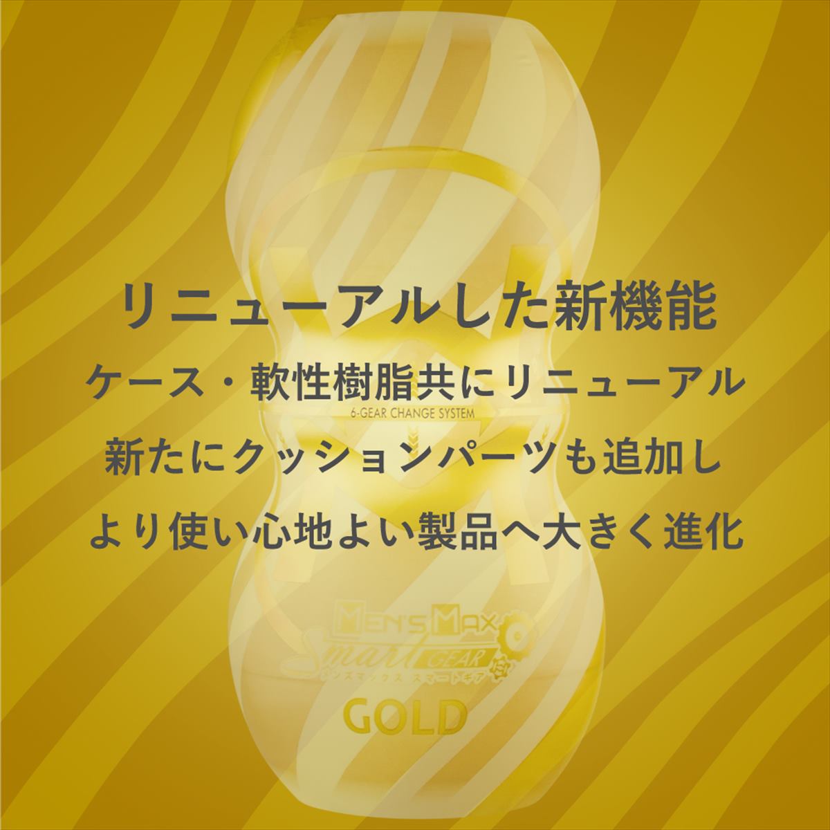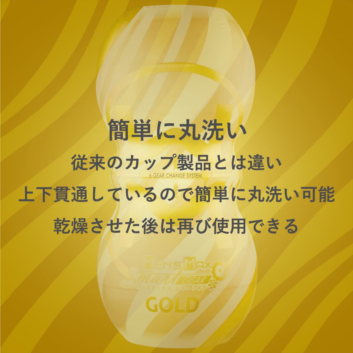 本体の上下を持って回すだけで内部の樹脂に捻れを発生させ、締めつけが調節可能なメンズマックススマートの新提案。締めつけレベルは超ソフトなLv.1から極狭のLv.6までの6段階がお楽しみいただけます。内部構造はヒダとリングの混合タイプ。縦に伸びたヒダはねじると螺旋状のヒダに変化し、強い刺激を与えます。中間に設置されたバルブはバキューム効果を高め吸いついて離しません。上下に挿入口が施されていますので二つの挿入感を楽しめるのが特徴。