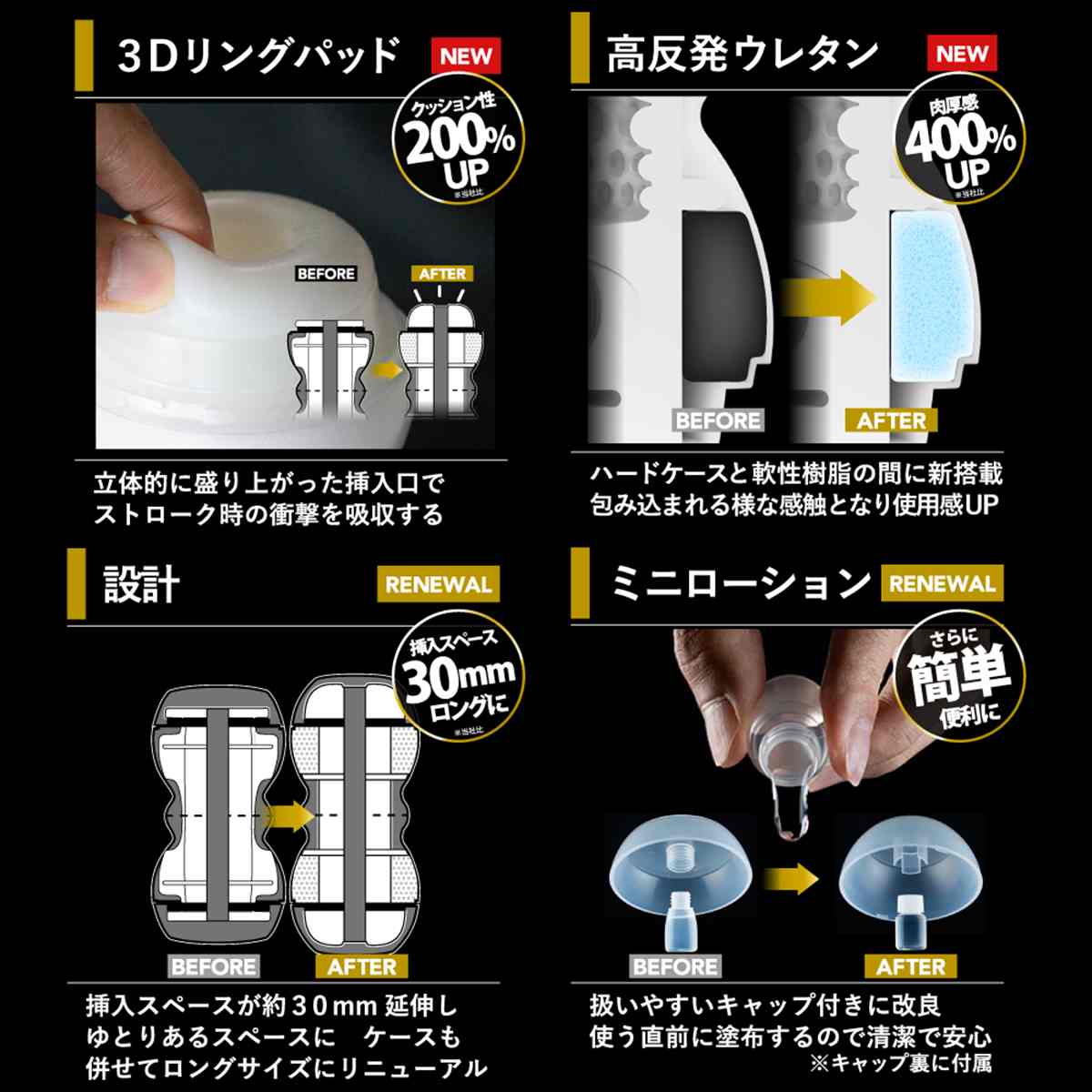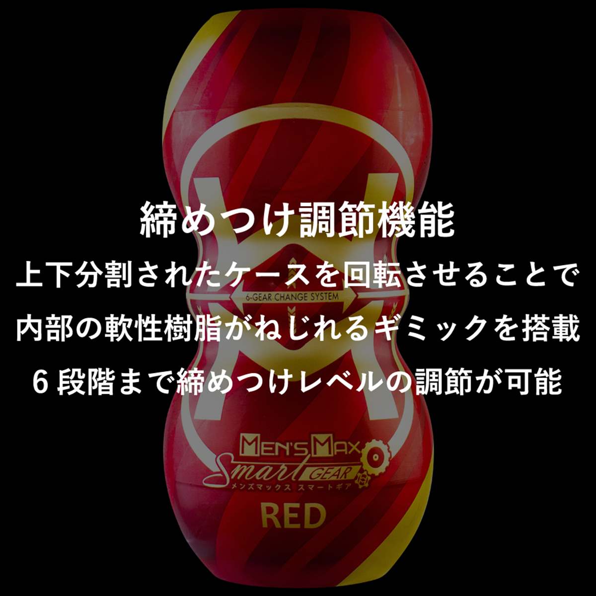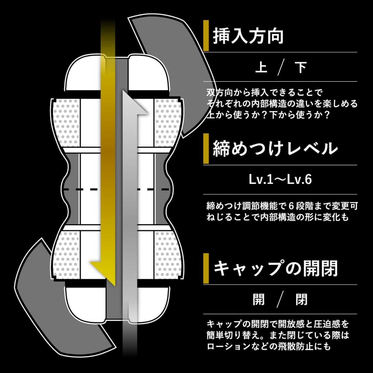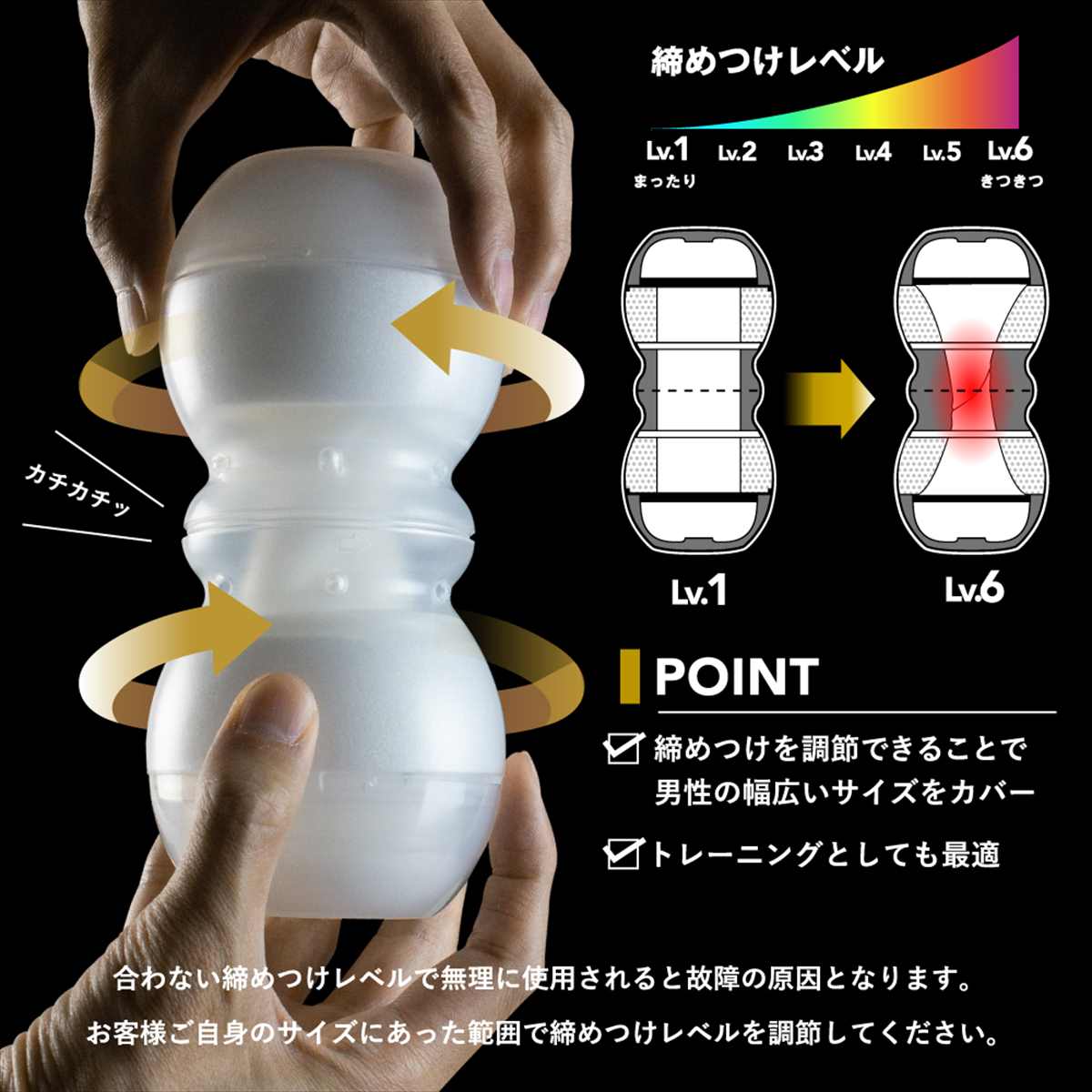 本体の上下を持って回すだけで内部の樹脂に捻れを発生させ、締めつけが調節可能なメンズマックススマートの新提案。締めつけレベルは超ソフトなLv.1から極狭のLv.6までの6段階がお楽しみいただけます。内部構造は大型弾力ボールとねじれば絡みつく縦型ストリング。スマートギア初期モデルにふさわしい王道の構造。上下に挿入口が施されていますので二つの挿入感を楽しめるのが特徴。