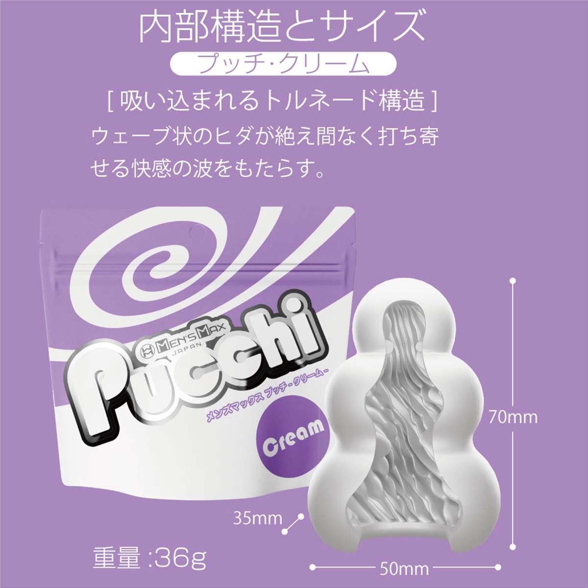 ポケットサイズのローション不要ホールプッチシリーズが生まれ変わって新登場。軟性素材から内部の構造、パッケージ、全てが新しくなりました。今回新たに導入した「HD(High Definition)成形」で突起のデコボコ感がさらにクッキリになりました。突起に触れたときの粒立ちが違います。また、「HD 成形」により軟性樹脂の弾力性も向上。さらにモッチモチに、しなやかな素材になりました。ローション不要軟性素材「プラスウェッチ」樹脂は、水分が付着すると潤い成分が反応、ねっとりした潤いに包まれます。「クリーム」は斜めに擦り上げてくるヒダがクリームのように昇りつめる絶頂感を生み出します。