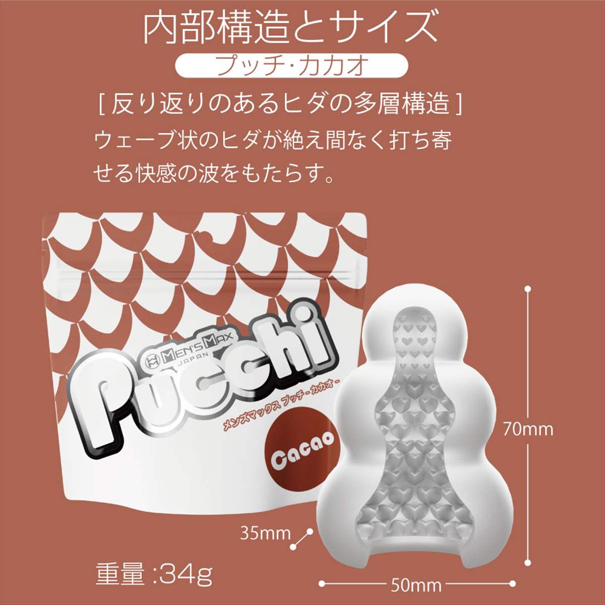 ポケットサイズのローション不要ホールプッチシリーズが生まれ変わって新登場。軟性素材から内部の構造、パッケージ、全てが新しくなりました。今回新たに導入した「HD(High Definition)成形」で突起のデコボコ感がさらにクッキリになりました。突起に触れたときの粒立ちが違います。また、「HD 成形」により軟性樹脂の弾力性も向上。さらにモッチモチに、しなやかな素材になりました。ローション不要軟性素材「プラスウェッチ」樹脂は、水分が付着すると潤い成分が反応、ねっとりした潤いに包まれます。「カカオ」はビッシリ並んだヒダが反発しながら複雑に絡みつく刺激を楽しめます。