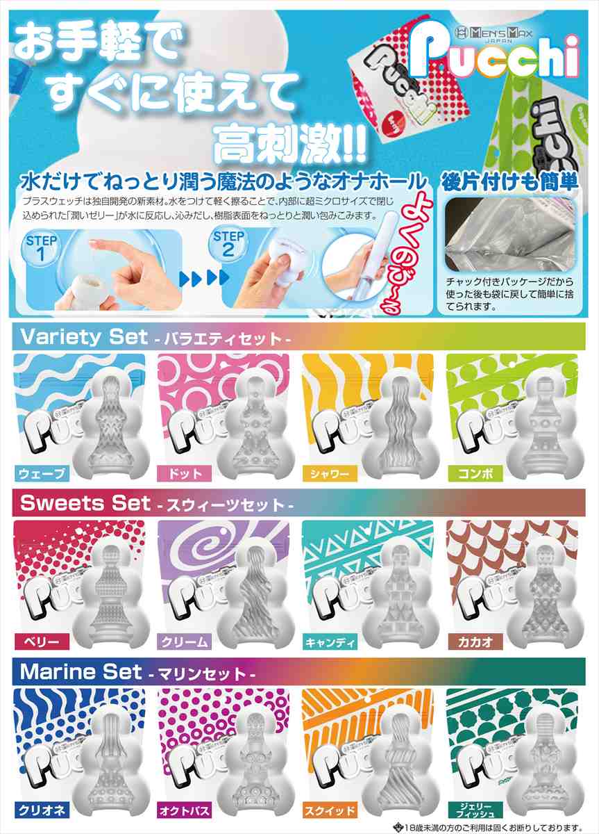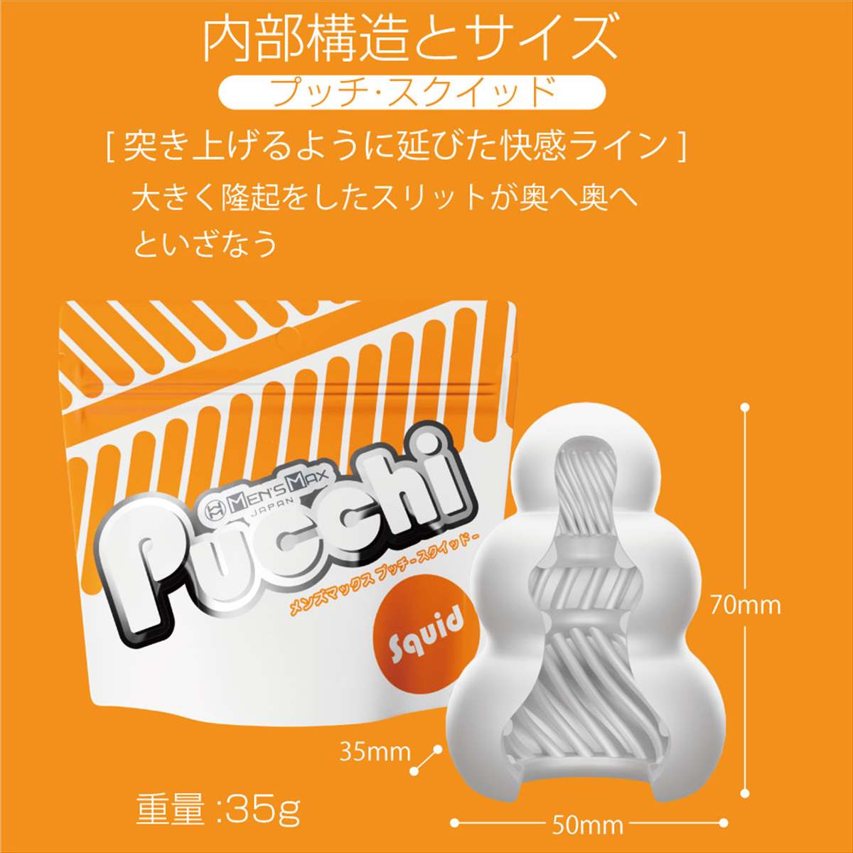 ポケットサイズのローション不要ホールプッチシリーズが生まれ変わって新登場。軟性素材から内部の構造、パッケージ、全てが新しくなりました。今回新たに導入した「HD(High Definition)成形」で突起のデコボコ感がさらにクッキリになりました。突起に触れたときの粒立ちが違います。また、「HD 成形」により軟性樹脂の弾力性も向上。さらにモッチモチに、しなやかな素材になりました。ローション不要軟性素材「プラスウェッチ」樹脂は、水分が付着すると潤い成分が反応、ねっとりした潤いに包まれます。「スクイッド」は大きく隆起したスリットが奥へ奥へといざなう快感を楽しめます。