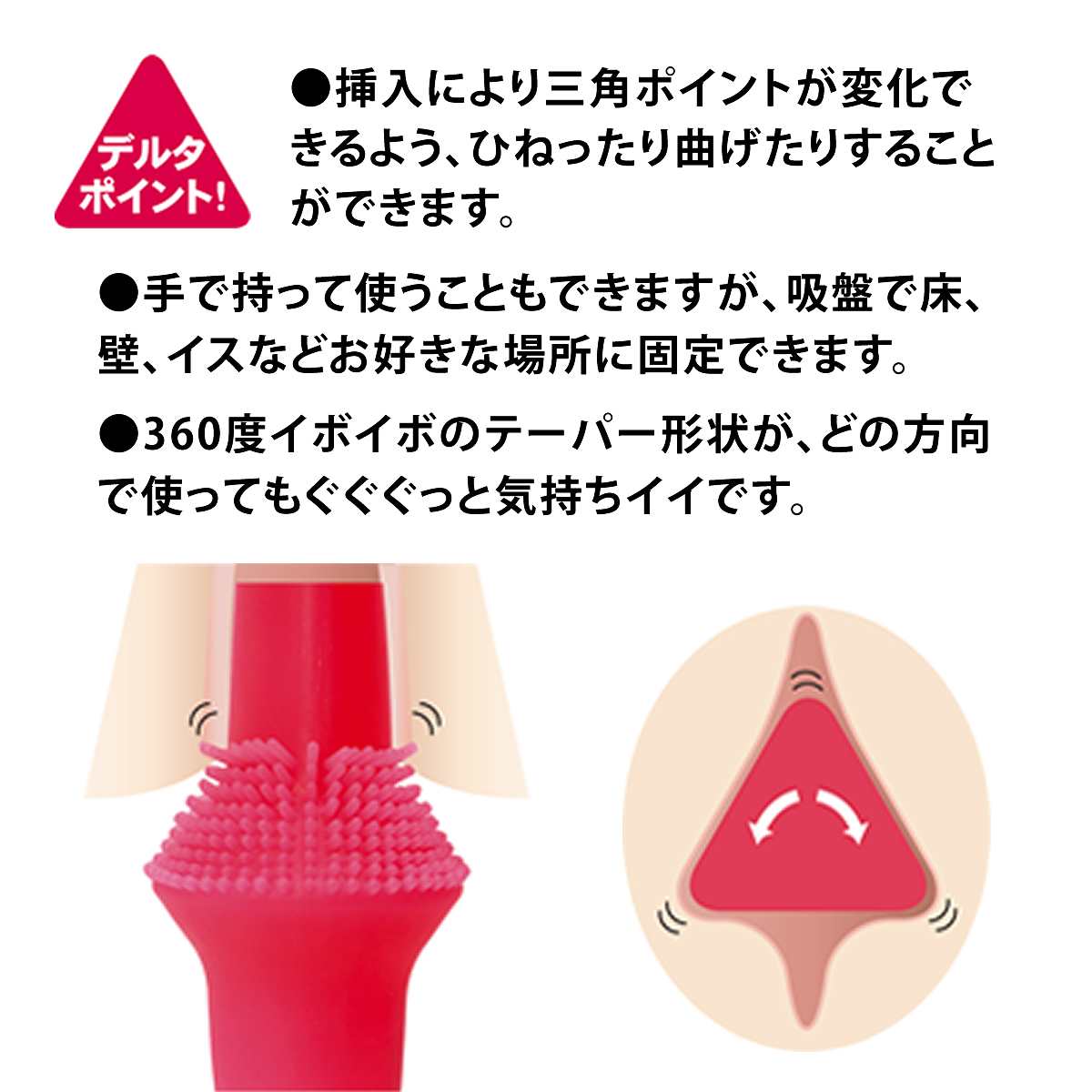 ●好みの形状に変形できる三角ディルド。●本体をヒネったまま吸盤で固定するだけで、かき回されているかのような快感。●曲げればGス○ット刺激をお楽しみいただけます。●イボ部分はテーパー形状(円錐形状)になっており、入り口を徐々に広げ快感が増します。●デルタは、ギリシャ文字の「Δ」で、三角形を表します。また、女性の下腹部(股間部分)もそのように呼ばれたりします。
