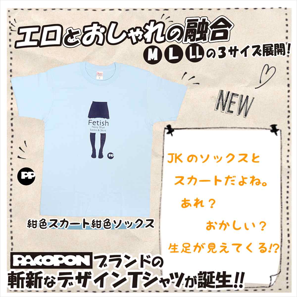 ●エロとおしゃれの融合。PACOPONオリジナルTシャツです。●フェチをテーマに、紺色の制服スカートと紺色ソックスがデザインされています。●まったくエッチではないのでかわいく着こなすことができます。●サイズはLLサイズです。