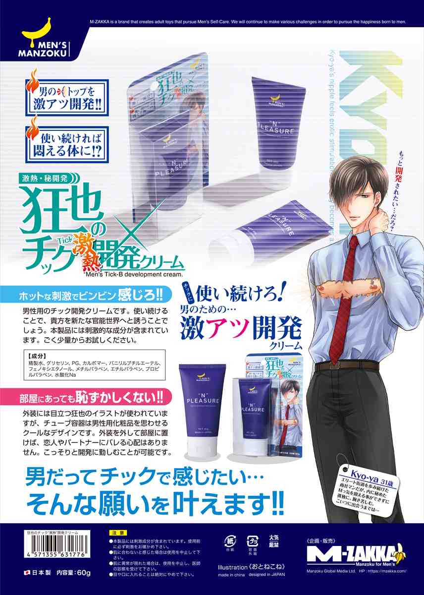 Mっ気のある男性に人気の狂也シリーズより、乳首開発クリームが登場。その名も「狂也のチック激熱”開発クリーム」です。乳首は男女問わず快感を得やすい箇所ですが、開発しなければ特に感じる箇所ではありません。ただし一度感じる様になれば、強力な性感帯になる可能性を秘めています。そんな乳首開発の手助けになるのが、このクリーム。男性の乳首開発に適した成分を含んでおり、使い続けることで感じる乳首へと成長することが期待できます。パッケージは派手な狂也のイラストが目を引きますが、チューブ容器は男性用化粧品の様な爽やかさがあります。パッケージから取り出せば、部屋に置いてあっても違和感なく周囲の景色に溶け込むデザインです。「このパッケージはちょっと恥ずかしい…」とか「彼女・親兄弟にバレたら嫌だな…」という方でも、安心してお使いください。本製品はホットな刺激成分を含んでいます。使用の際はごく少量からお試しください。また絶対に口に含まないようにお願い致します。本製品は安心・安全の日本製クリームです。男の乳首を成長させる「狂也のチック”激熱”開発クリーム」。乳首で感じたいM心のある男性にオススメの商品です。※この商品は、薬機法に基づく医薬品等ではございません”