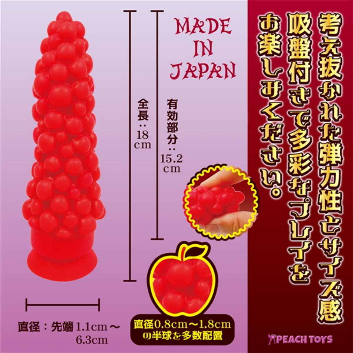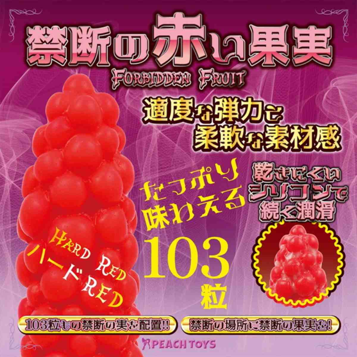 ”禁断の果実だからこそ、人々は思わず手を伸ばす。。103粒がランダムに配置された円錐型のディルドが登場!先端は小さく、段々と広がる円錐形状につれて、快感もヒートアップ間違いなし!!考え抜かれた弾力性とサイズ感。吸盤付き。おススメのクリーム。潤滑が長く続き、乾きにくい「プレミアムシリコンクリーム」(別売)。グリセリンフリーで安心。高潤滑クリームで、たっぷりと103粒の大小突起を感じてください。ハードレッドは弾力がある硬めの素材で、中級者〜上級者まで楽しめます。この形状と硬さで、上級の快感をお楽しみください。”