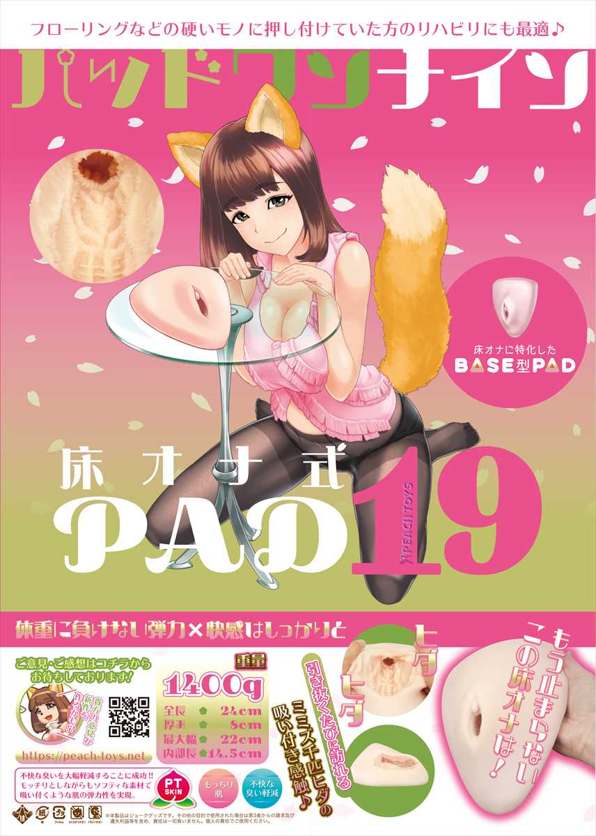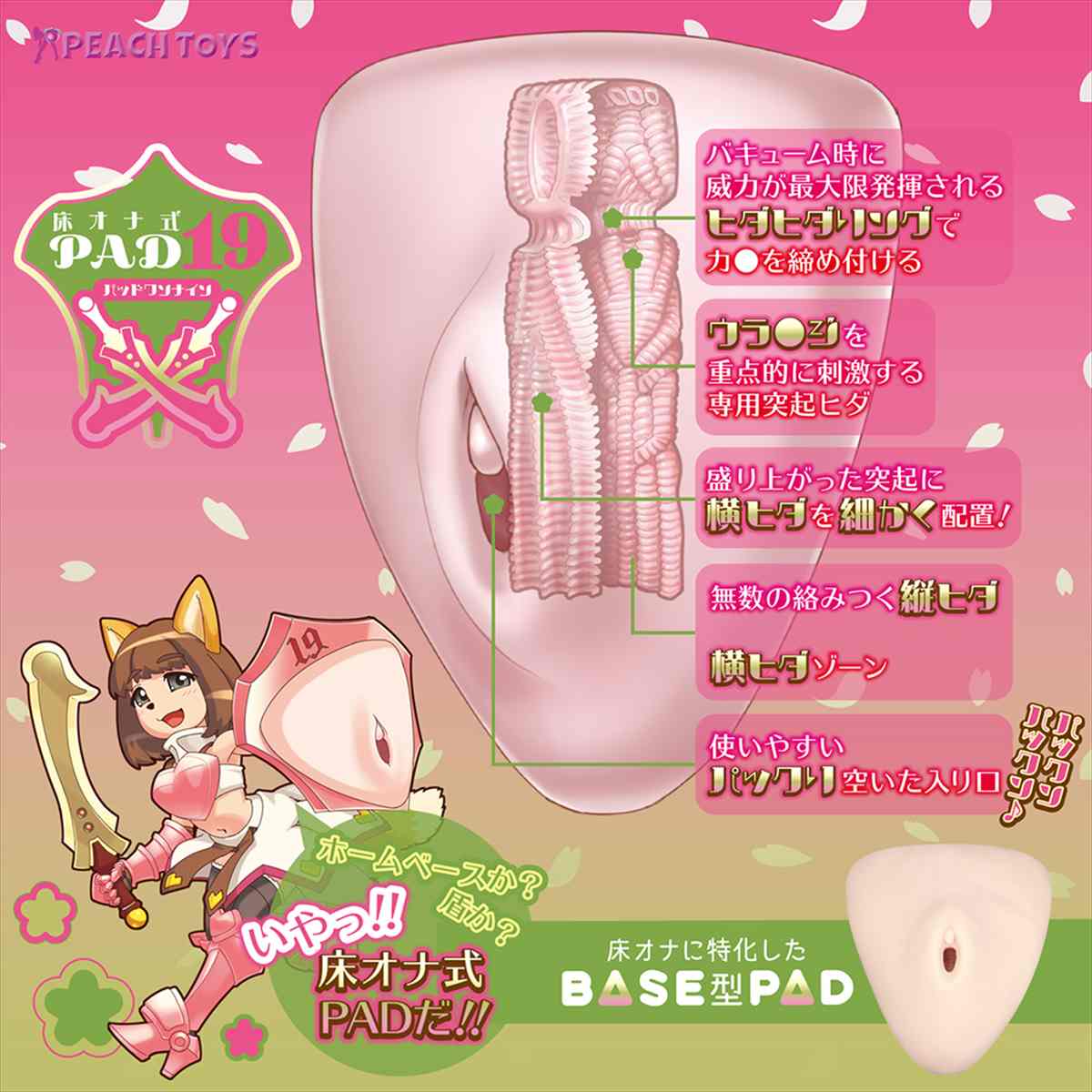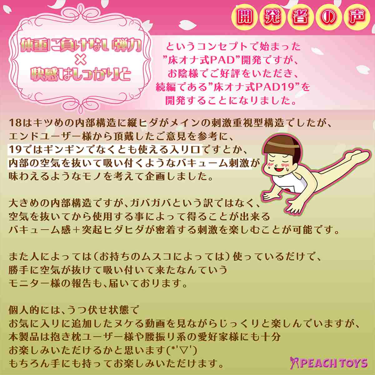 『もう止まらない!この床オナは!!』床オナ式シリーズ「床オナ式PAD19」が新登場。『体重に負けない弾力!快感はしっかりと!』床オナニー専用BASE型パッド。広めの入り口が特徴的で、ギンギンの状態でなくともスタート可能。盛り上がった縦ヒダ突起に細かい横ヒダが無数に広がるミミズ千匹。大きめの内部は、空気を抜いて使用すると、ぎゅっと吸い付くバキューム刺激とミミズ千匹ヒダの吸い付き感触がたまりません!