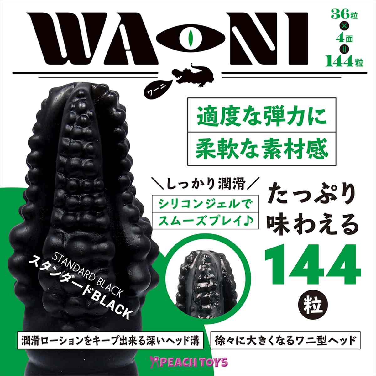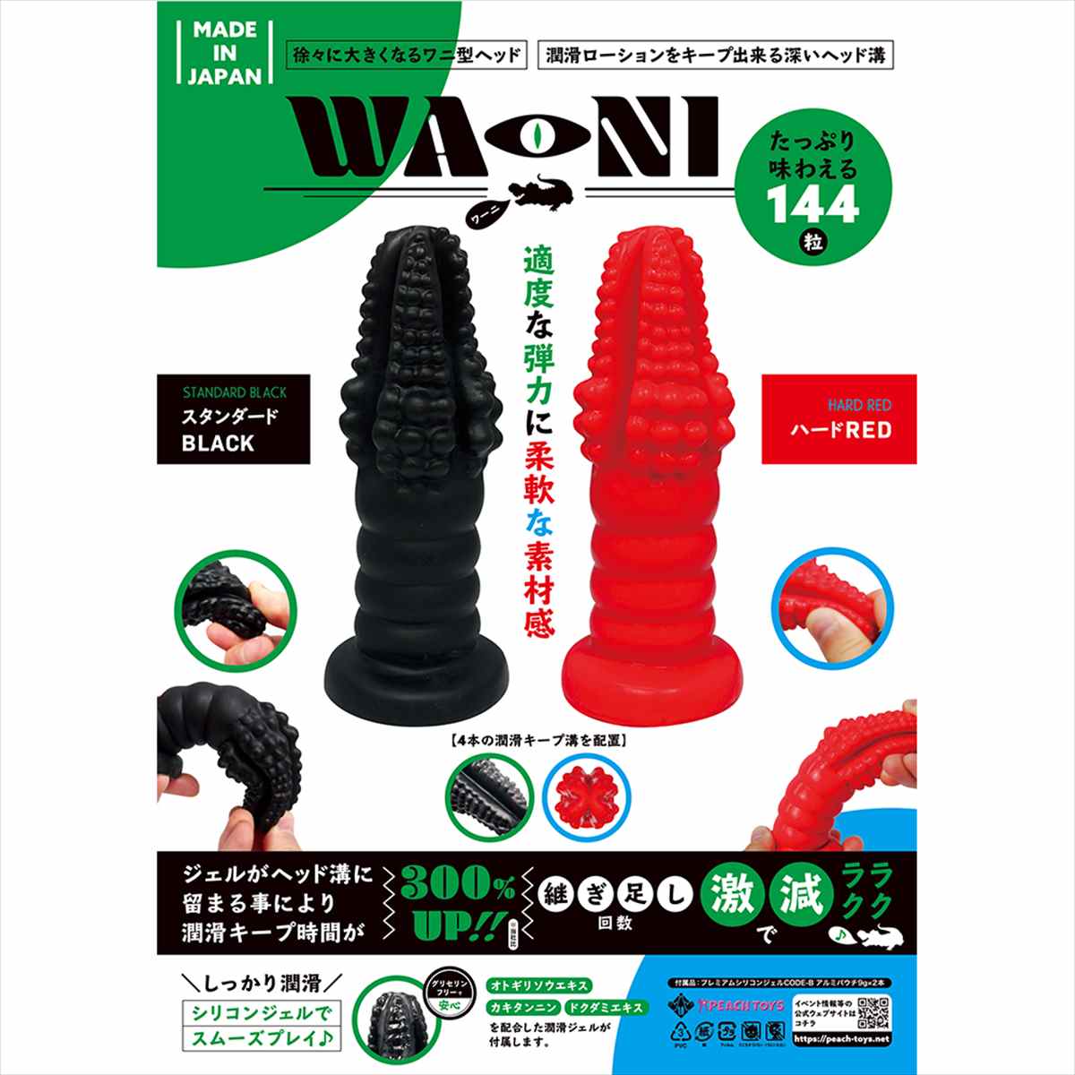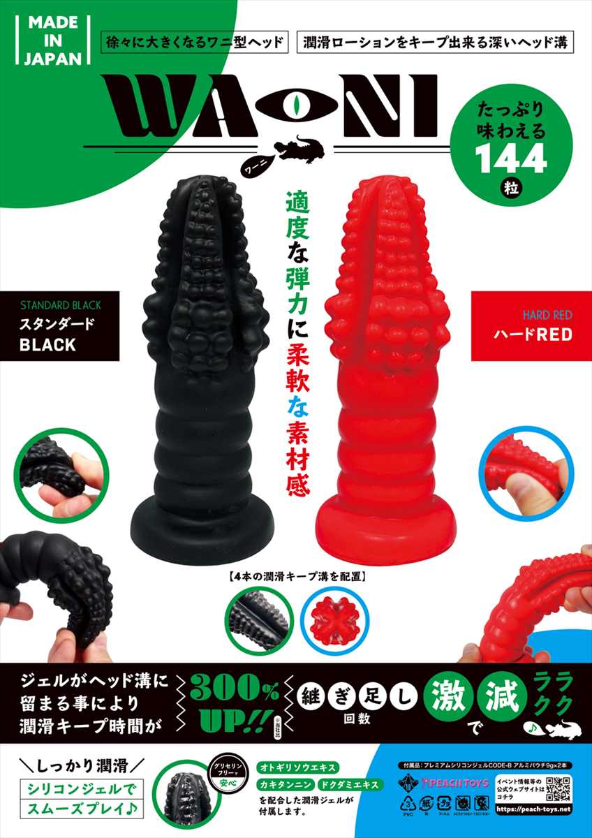 もう面倒くさくないんです!!ローションの継ぎ足しの悩み解消!!潤滑キープ時間300%アップのバックディルド「WA-NI(ワーニ)」の登場です!!「乾きにくいローションを使っても、プレイ中の継ぎ足しが面倒・・・」との声に応え、深いキープ溝を4本配置し、潤滑ローション溜まりにより、継ぎ足し回数激減。名前の由来にもなった徐々に大きくなるワニ型ヘッドは、前半はスタートしやすい直径1.3、中盤はググっと押し上げる直径4.9、初級者から上級者まで満足できるサイズ。たっぷりと味わいたい144粒は、先端から中盤にかけて段々と大きな粒。●スタンダードBLACKは、ソフトな素材で初級者から上級者にも使いやすい柔らかさ。弾力抜群の柔らかい素材で、いつでもプニプニと触っていたくなる弾力です。●プレミアムシリコンジェル「CODE-B」(9gアルミパウチ)2本付属●素材:PVC●安心の日本製