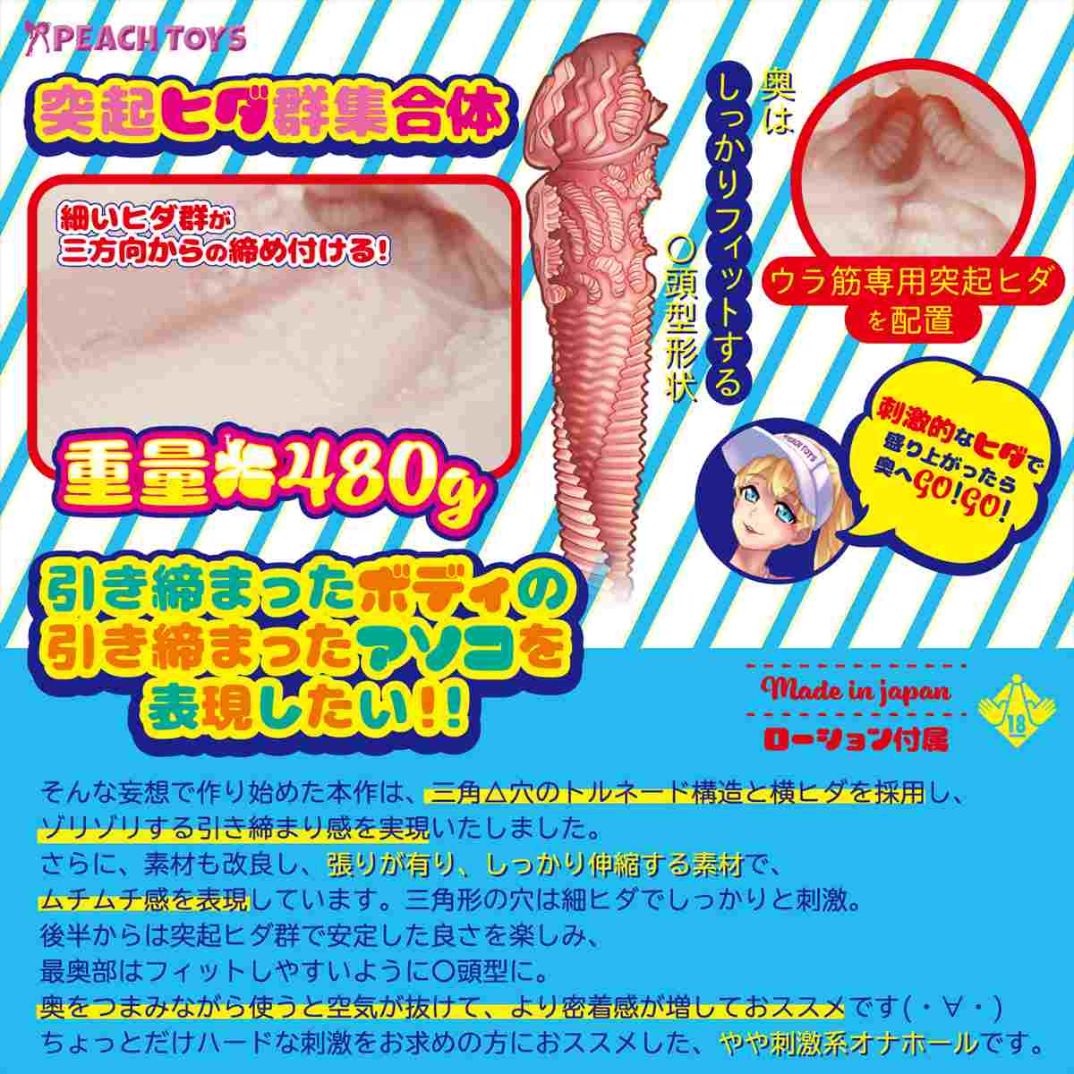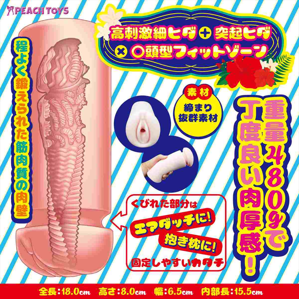 「ピチピチピーチ娘とゾリゾリリゾートへLet〜〜〜〜〜〜〜’s go!!」燦燦と降り注ぐ太陽とビーチではじける笑顔!締め付け抜群のアソコを持つという美女…。引き締まったボディと引き締まったアソコを再現したオナホールです。前半は人工的過ぎないように調節した浅めの横ヒダを3面に配置し、ねじりました。三角△穴のトルネード構造で、ストロークするごとに刺激面が変化し、三方向から細い横ヒダがゾリゾリと締め付けます。キツいだけじゃない程よく変化する刺激と締め付け抜群のアソコを再現しちゃいました。後半は、突起ヒダをポコポコと配置し、一番奥は、〇頭型の内部構造でフィットしやすく、大き目の突起ヒダが超刺激的!!奥の空気を抜いて、ウ〇筋に当たるよう使えば更に素晴らしい快感で、一気に盛り上がります。丁度良い肉厚感!締め付け感とフィット感の最強コラボオナホール!!時間をあまり掛けずにヌキたい方おススメ。安心の日本製。