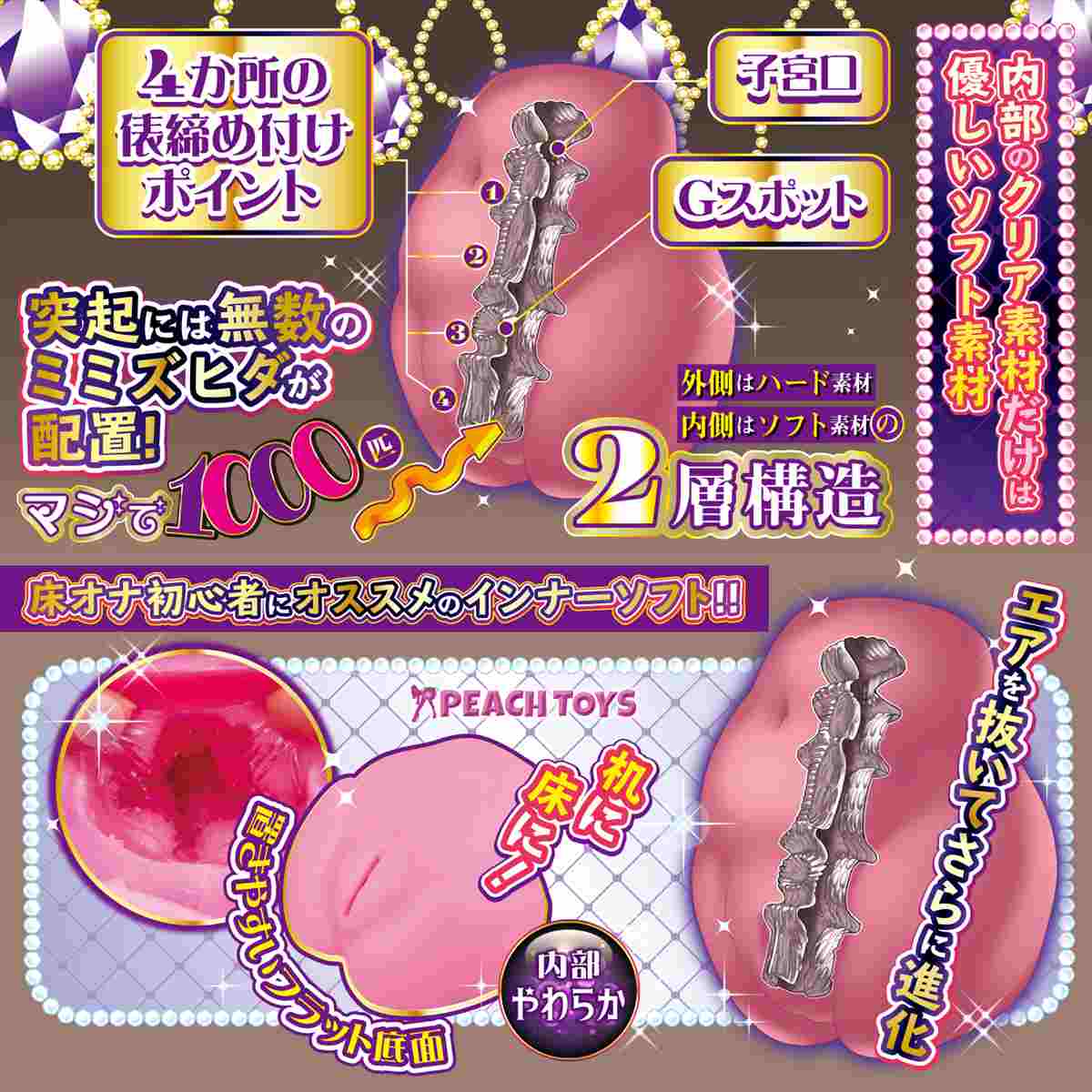 床オナ式名器シリーズに「ミミズ締め」が新登場!!『床オナでもっともっと名器を楽しみたい!』その思いで名器のハイブリッド構造「俵締め×ミミズ千匹=究極の名器」を開発。締め付けられる名器俵締め”は、4か所の俵締め付けポイントを配置。マジで千匹の”ミミズ千匹”は、ミミズヒダをリアルに1000本配置。突起の無数のミミズヒダは、ミミズ1000%の快感!エアを抜いてさらに進化!!奥から空気を抜くと、密着感と真空吸い付き感を味わうことが可能。内部の並んでいる大きい突起が、グニュグニュと自由に動きます。体重を掛けると下の突起が広がったり、手で持ったり机に置くと、上下均等な圧になったりと、内部は貴方好みに、様々な表情を覗かせてくれるでしょう。【インナーソフト】・外は硬め 中は柔らか仕上げ・床オナ初心者はコチラがおすすめ♪同時発売の床オナ式名器のために作られた「床オナ式ローション」もおススメ!”