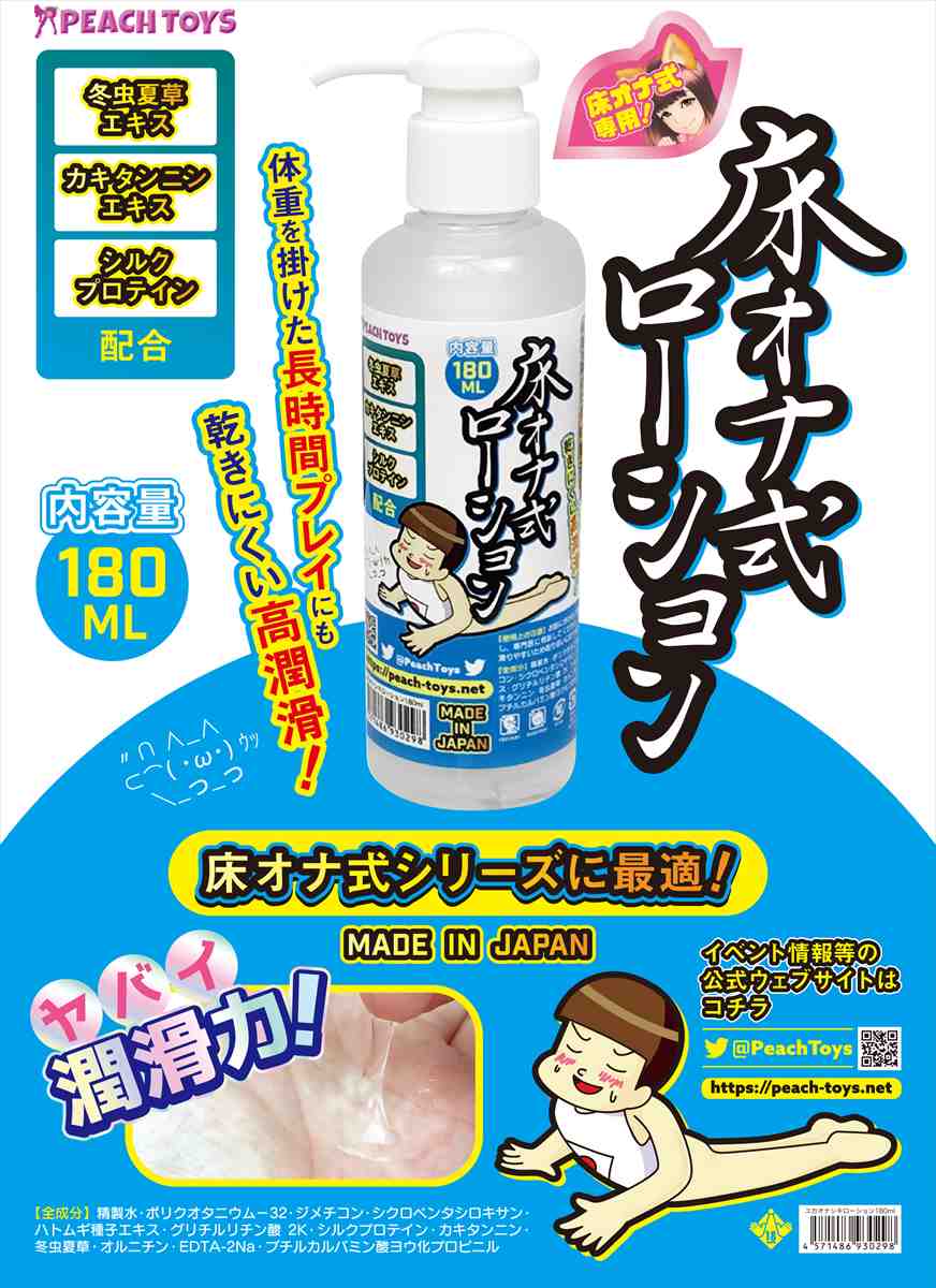 床オナ好きの人に贈る…床オナのための床オナ式ローションがここに誕生!!床オナ式ローション180mlの新発売です。体重を掛けた長時間の床オナにも耐えられる潤滑性能!!乾きにくい高潤滑!!さらに内部のヒダ感触も、ローションが邪魔をせずに繊細に感じとれます。床オナ式名器シリーズ、床オナ式PADシリーズに最適なローションです。 特に硬めの床オナ系オナホールにはかなり役立つでしょう。●MADE IN JAPAN■ 注意事項万が一お肌に異常が見受けられた場合使用を中止してください。※アレルギーをお持ちの方は使用をお控えください。※安心の日本製です。※効果効能を保証するものではありません。※大変滑りやすいので使用には十分注意してください。