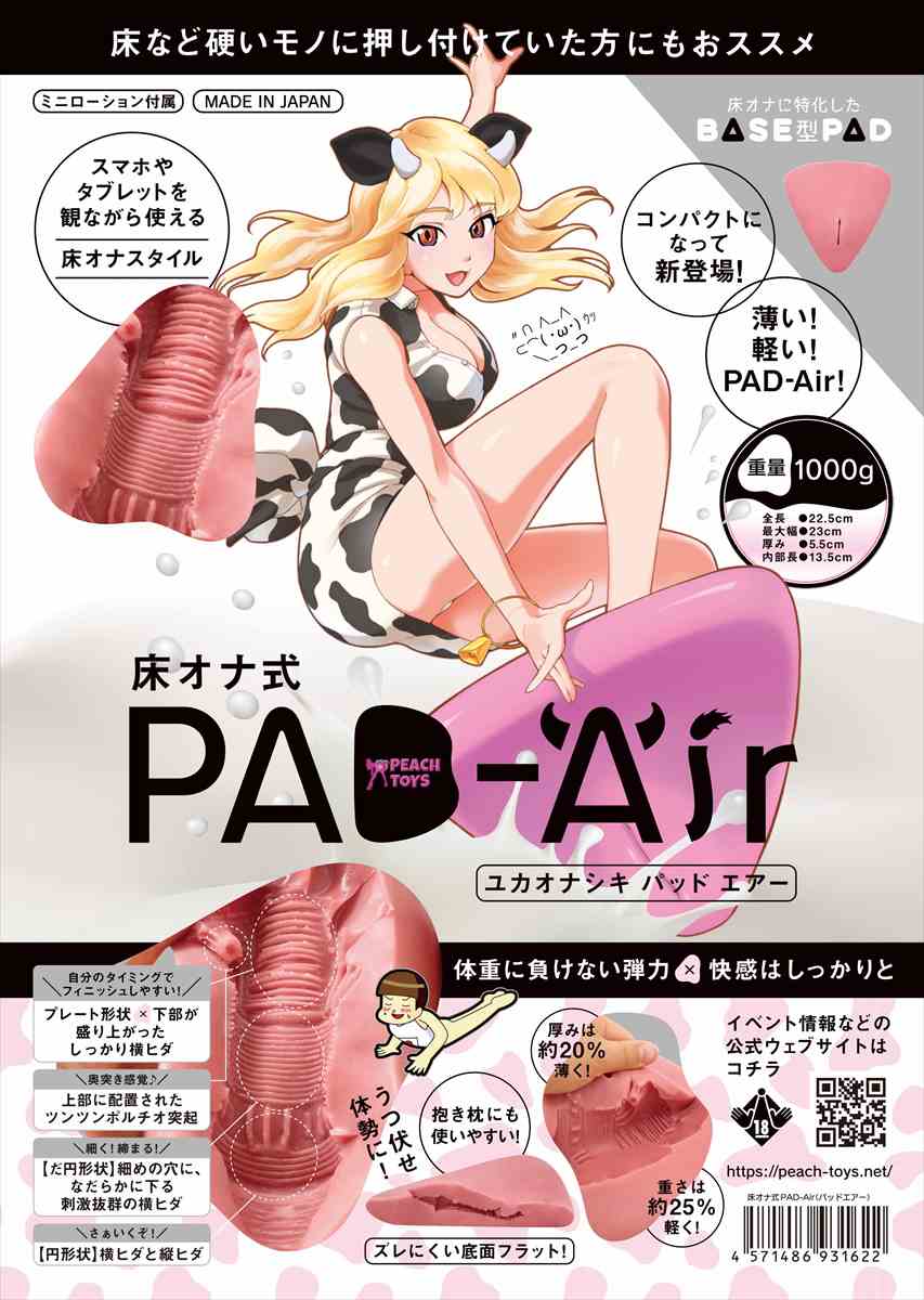床オナ式PADシリーズに薄い!軽い!コンパクトサイズ「Pad-Air(パッドエアー)」誕生!「体重に負けない弾力×快感はしっかりと」好評の床オナ式PADシリーズのコンセプトはそのままに、より多くの方に楽しんでいただけるギリギリのコンパクトサイズを追求!より持ち運びやすく、使いやすいように、試行錯誤の結果、厚みは約20%薄く、重さは約25%軽く!快感と安定感はそのまま!なだらかに下るヒダ道を奥に進むとコリコリ感のあるポ○チオ突起が中盤上部に配置。内部の3種類の横ヒダ(円形状→だ円形状→ワイドなプレート形状)の変化と、なだらかな下りがもたらす奥への突入感をお楽しみください。●スマホやタブレットを観ながら使える床オナスタイル!●床など硬いモノに押し付けていた方にもおススメ!●うつ伏せ体勢に!抱き枕にも使いやすい!●ズレにくい底面フラット!●MADE IN JAPAN▼商品紹介動画はコチラ!