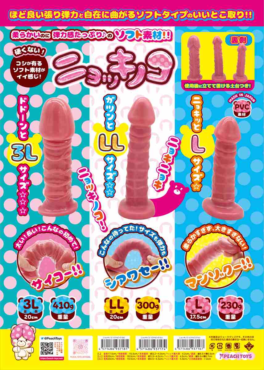 『ニョキニョキニョッキノコ!』柔らかいのに弾力感たっぷり♪のソフト素材のピンクカラーディルド!!「ニョッキノコ(ソフトピンク)」ディルドの登場です!●使用後に立てて置ける土台つき!●柔らかいのに弾力感たっぷり♪のソフト素材!!●ほど良い張り弾力と自在に曲がるソフトタイプのいいとこ取り!!●硬くない!コシが有るソフト素材がイイ感じ!●素材:PVC●MADE IN JAPAN●サイズは、お好みに応じて、3タイプの【Lサイズ】【LLサイズ】【3Lサイズ】をご用意。【LLサイズ】の特徴!・ガツンとLLサイズ☆☆・ディープなポイントにタッチできちゃうロングサイズ!・こんなの待ってた!サイズも弾力もシアワセー!!