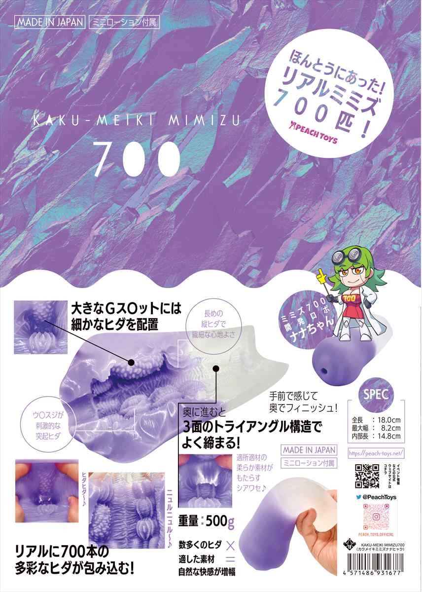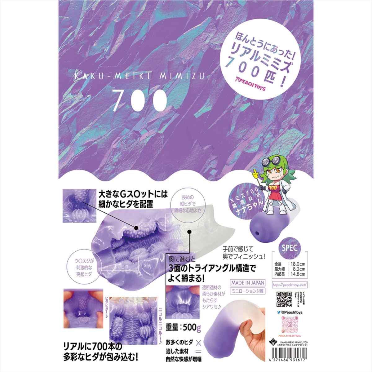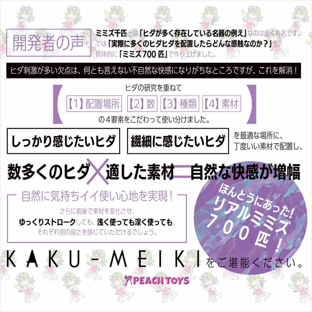 名器に革命!『KAKU-MEIKI MIMIZU700』ミミズ千匹とは「ヒダが多く存在している名器の例え」なのは広く有名です。では「実際に多くのヒダヒダを配置したらどんな感触なのか?」を、真面目に「ミミズ700匹」で作り上げました。リアルに700本の多彩なヒダが包み込む!!ヒダの研究を重ねて、配置場所、数、種類、素材の4要素をこだわって使い分けました。「しっかり感じたいヒダ」「繊細に感じたいヒダ」を最適な場所に、丁度いい素材で配置し、『数多くのヒダ×適した素材=自然な快感が増幅』自然に気持ちイイ使い心地を実現!さらに前後で素材を変化させ、ゆっくりストロークしても、浅く使っても深く使っても、それぞれ別の良さを感じていただけるでしょう。ほんとうにあった!リアルミミズ700匹!マジで700匹のKAKU-MEIKIをご堪能ください。