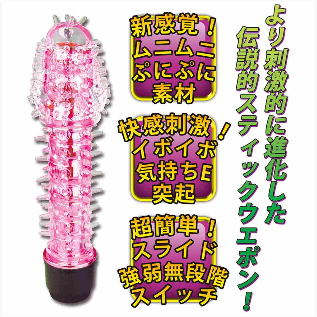 伝説的大ヒットバイブスティック【IKACEL】にイボイボ使用の新しい仲間が登場!触り心地満点のムニムニ新感触素材についたポッチイボが最高にマッチ!操作方法はとっても簡単!電池を入れてキャップを回転させるだけの無段階強弱調整式スタイル!安心素材にしっかり気持ち良い振動と感じるポイントを徹底的に計算した形状。全てがモンスター級の次世代バイブスティック登場!