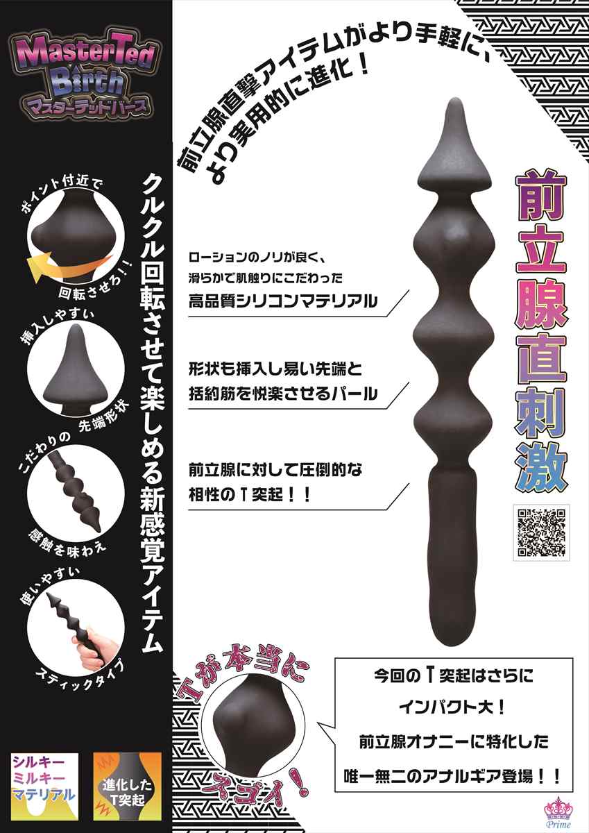 前〇腺直撃アイテム【マスターテッド】がより手軽に、より実用的に進化!ローションのノリが良く、滑らかで肌触りにこだわった高品質シリコンマテリアル採用。形状も挿入し易い先端と括約筋を悦楽させるパールに、前〇腺に対して圧倒的な相性のT突起!!今回のT突起はさらにインパクト大!前〇腺オナニーに特化した唯一無二のア〇ルギア登場!!