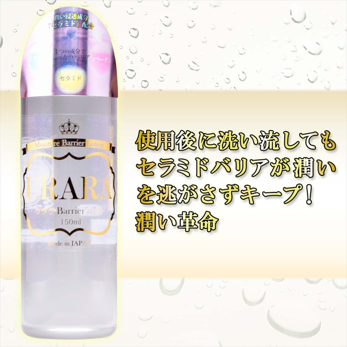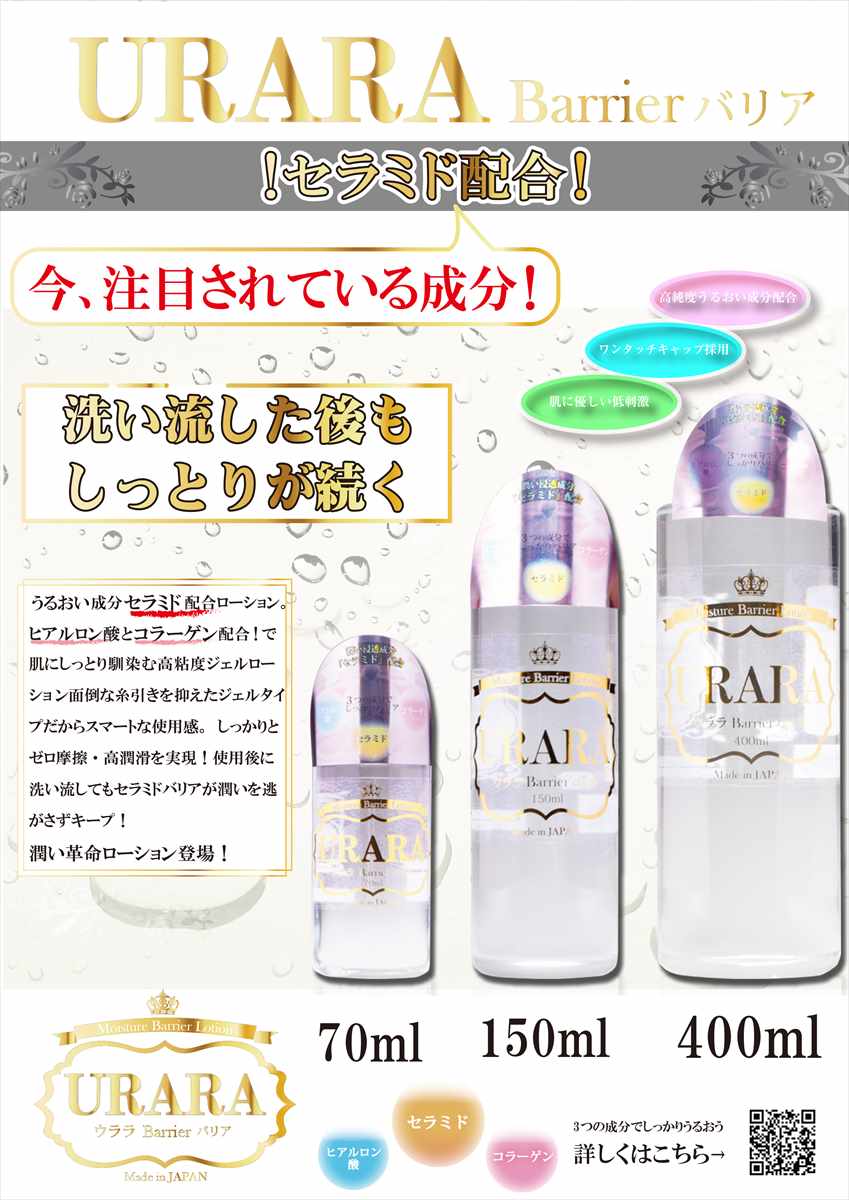 潤い浸透成分【セラミド】配合ローション。ヒアルロン酸とコラーゲン配合で肌にしっとり馴染む高粘度ジェルローション。面倒な糸引きを抑えたジェルタイプだからスマートな使用感。しっかりとゼロ摩擦・高潤滑を実現!使用後に洗い流してもセラミドバリアが潤いを逃がさずキープ!究極の潤い革命ローション登場!