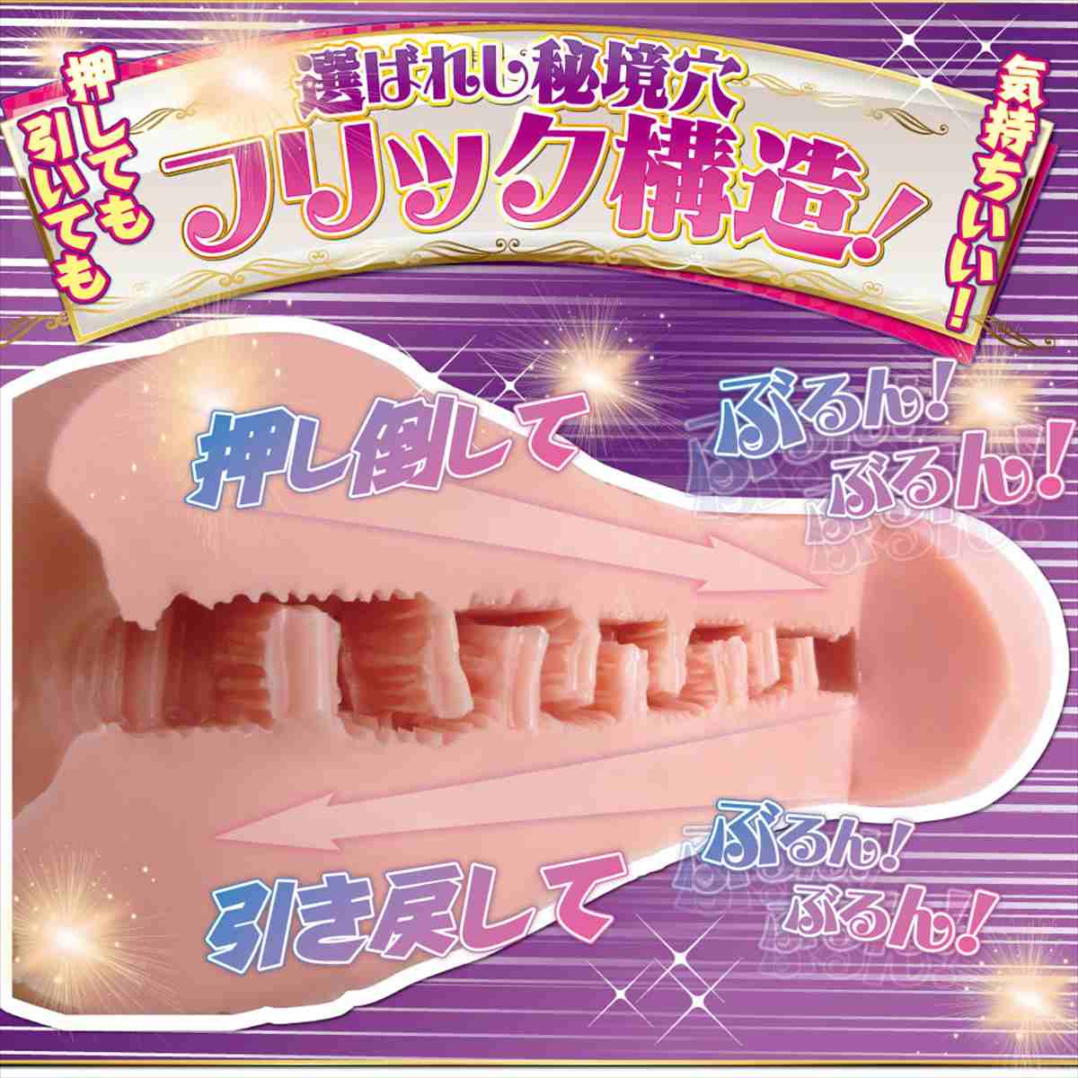 上から下から乱れフリック!押しても引いても気持ちイイ、フリック構造です。フリック刺激が行ったり来たり。押しフリックでぶるんっ!引きフリックでもぶるんっ!選ばれし秘境穴で肉ヒダ壁が天地でペロンペロンと乱舞。フリッカーの絶妙な間隔で成し得る、この不思議間隔。倒して突入!ペロンっとバック!新感覚フリックスタイルをお試しあれ。