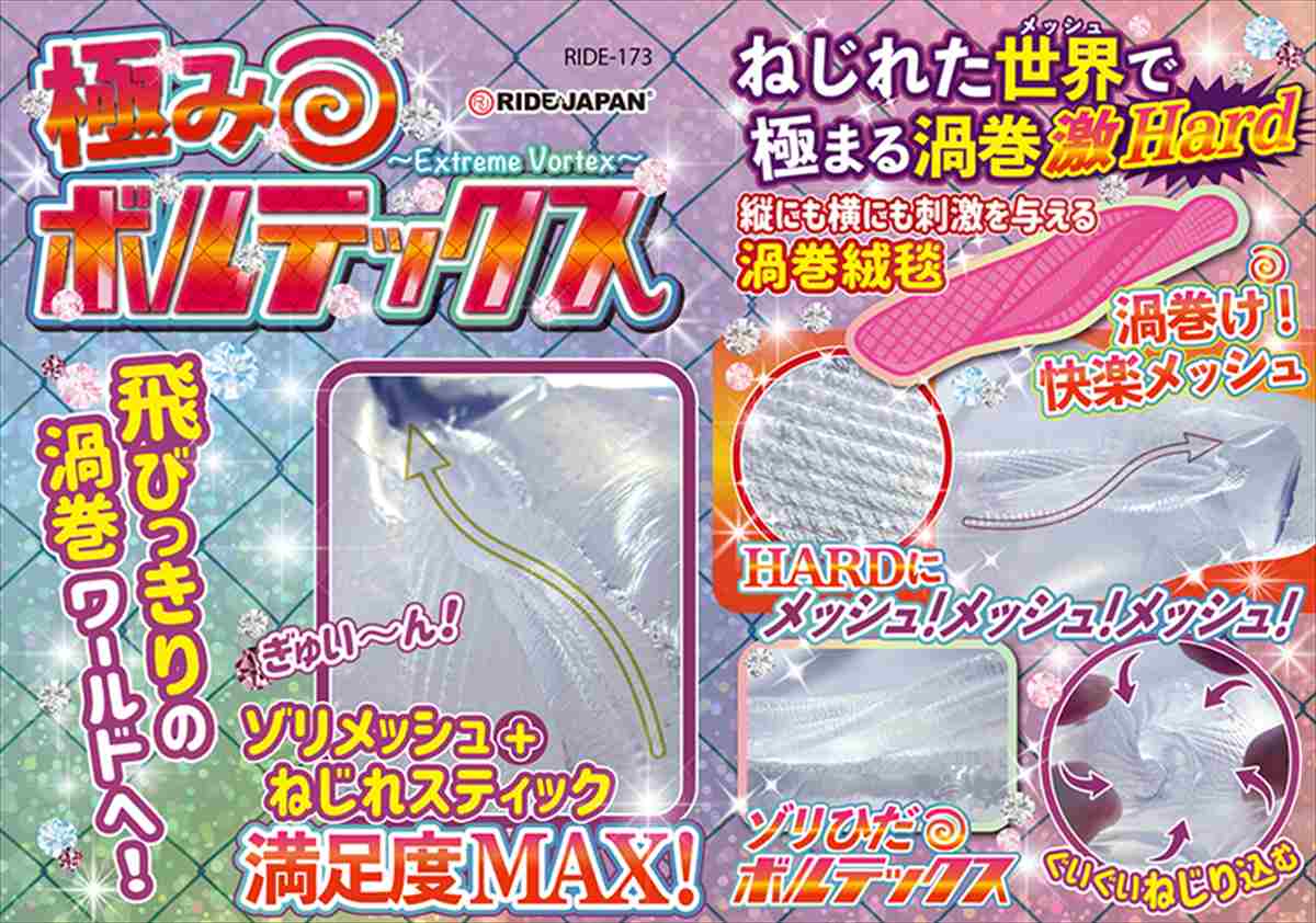 ねじれたメッシュで極まる渦巻激ハードホール!縦にも横にも刺激を与える渦巻絨毯。ぐいぐいねじりこむ回転メッシュ。硬弾力スティックとゾリメッシュに挟まれてねじり込む。渦巻くメッシュ、絡めるスティック、捻じれる刺激でハードに渦巻け!飛びっきりの渦巻メッシュワールドへ。