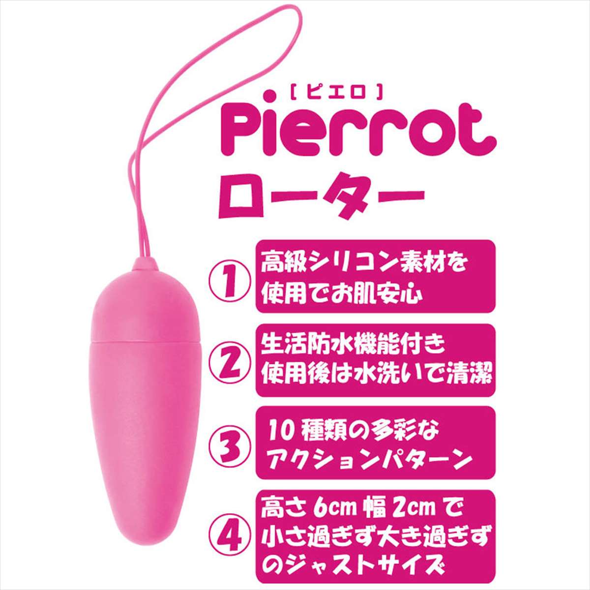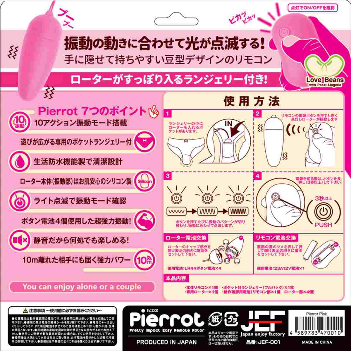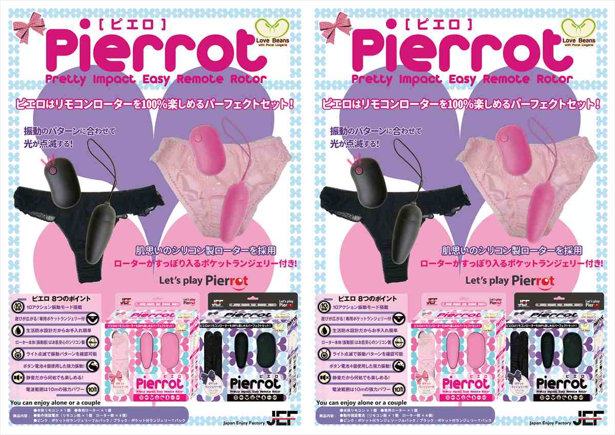 可愛くて、強力で、扱いやすい、パーフェクトリモコンローター「ピエロ」。手に持ちやすいリモコンは操作性抜群。ボタン一つで簡単操作。電源オンオフはライトの点灯でお知らせ、さらに振動パターンも点滅で分かる仕様。電波範囲は10mの強力パワー。ローターは肌に安心のシリコン製、10モードの多彩なアクション搭載、大きさも6cmとジャストサイズ、生活防水機能付きなので水洗い可能。遊びの幅が広がる専用のポケット付きランジェリーがセットになってます。※ピンクのポケット付ランジェリーはフルバックタイプです。