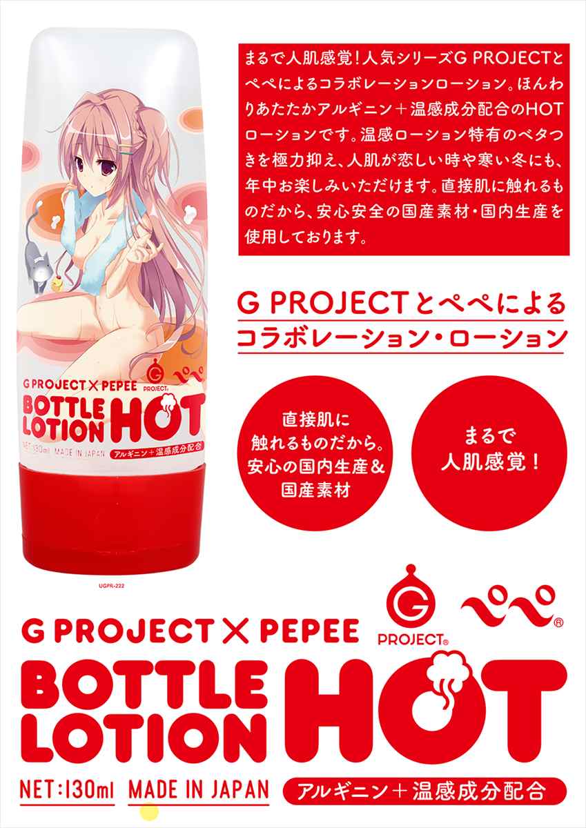 まるで人肌感覚!人気シリーズG PROJECTとぺぺによるコラボレーションローション。ほんわりあたたかアルギニン+温感成分配合のHOTローションです。温感ローション特有のベタつきを極力抑え、人肌が恋しい時や寒い冬にも、年中お楽しみいただけます。直接肌に触れるものだから、安心安全の国産素材・国内生産を使用しております。パッケージイラスト:高階@聖人検査番号:2102370